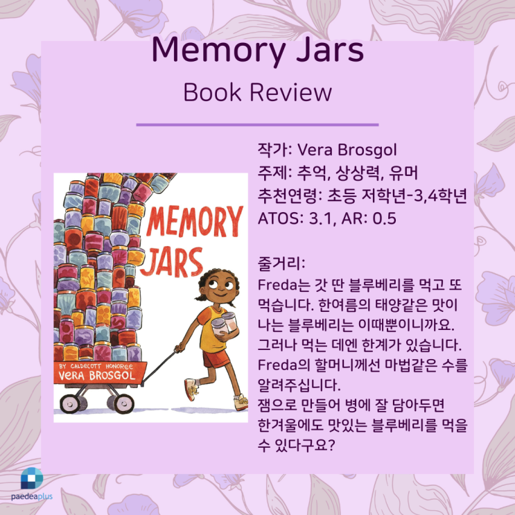 안녕하세요, 페디아플러스입니다. 오늘 소개해 드릴 책은 Vera Brosgol의 입니다. 얼핏 보면 제철 과일을 양껏 먹지 못해 귀여운 고민을 하는 Freda의 이야기이지만, 돌아올 수 없는 추억과 기억을 영원히 간직하고 싶은 어린아이의 순수함과 슬픔도 엿볼 수 있는 속 깊은 책입니다. 짧은 순간의 경험을 붙잡고 싶어 과자 봉지나 스티커, 인형 등 이해할 수 없는 잡동사니를 마구 모아야만 직성이 풀리는 아이나 학생이 있으신가요? 학부모님과 교사도 함께 읽어보기 좋은 도서입니다. - - - Come join our reading! . 페디아플러스 가맹 문의 1566-8492 cne@pongler.com <img src="https://blogthumb.pstatic.net/MjAyNjA0MTNfMTI5/MDAxNzc2MDcwMjgyMjQ1.6Iu_j_zNgZsFDYdox1SsqcSTbmeabv7NhANZwxhPzvMg.J794iQimxEkroENOHKw8ED4qDk_5bYl2ESMEFUpnxk4g.PNG/1.png?type=s3" />