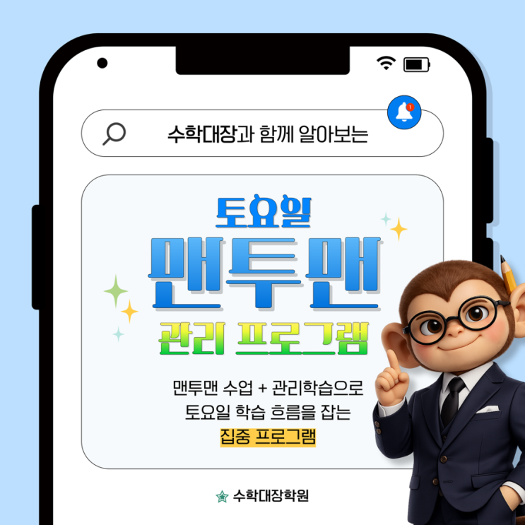 안녕하세요! 수학대장 입니다. 평일에는 학교와 학원 일정으로 시간이 빠듯해 집에서 복습이나 숙제까지 이어가기 참 어렵죠. 배운 내용을 바로 적용해볼 시간이 부족하거나, 혼자 공부하는 흐름이 자주 끊기거나, 경시·심화·내신을 더 밀도 있게 준비하고 싶은 학생이라면 주말 시간을 어떻게 활용하느냐가 정말 중요합니다. 수학대장이 준비한 [토요일 맨투맨 관리 프로그램]은 단단순히 수업만 듣고 끝나는 방식이 아니라, 1:1 맞춤 수업 + 관리학습을 통해 배우고 ➔ 풀고 ➔ 정리하는 흐름을 토요일 안에서 완성하도록 돕는 프로그램입니다. [수학대장 토요일 맨투맨 관리 프로그램] 수학대장의 토요일 맨투맨 관리 프로그램은 맨투맨 수업....... <img src="https://blogthumb.pstatic.net/MjAyNjA0MTdfOTUg/MDAxNzc2NDI2NjcyMzkz.bkhJamDhKQMP2o2FWlzLP-5TlguN_PF3Tb2ZDY4d0ugg.X3992nIiPqJZ9n2uuAYuTdID5B1C53dSQHw8ZGBFcpAg.PNG/1.png?type=s3" />