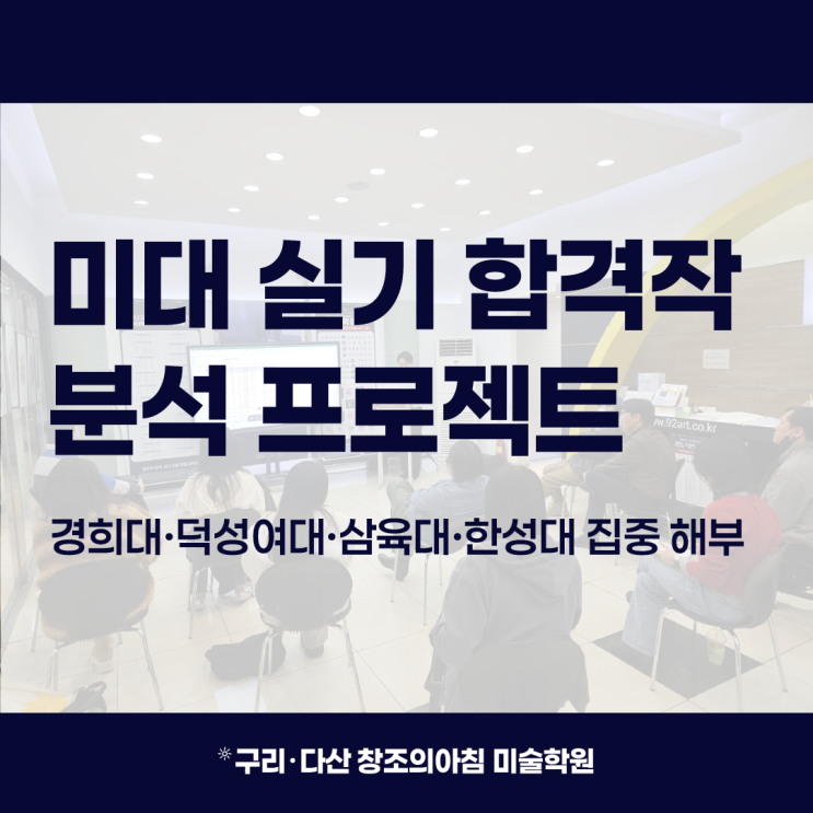 미대 실기 합격작 분석 프로젝트 경희대·덕성여대 삼육대·한성대 집중 해부!!! 올해 다산 미술학원 창조의아침에서는 조금 특별한 시도를 했는데요, 단순히 “이렇게 그려라”가 아닌 왜 합격하는지까지 파고드는 분석 중심 프로젝트를 진행했습니다!! 다산 미술학원 창조의아침 선생님들이 직접 팀을 나눠 대학별 실기 합격작을 분석하고 제안작까지 제작하는 2달간의 프로젝트를 진행했습니다. 대상 학교는 경희대학교 덕성여자대학교 삼육대학교 한성대학교 총 4개 대학이었습니다. 수시와 정시를 모두 아우르는 꽤 방대한 작업이었습니다. 왜 이 4개 학교인가? 이 네 학교는 실기 유형이 완전히 다른데요, 합격선도 다르고 표현 방식도 다르....... <img src="https://blogthumb.pstatic.net/MjAyNjA0MjhfMTgg/MDAxNzc3MzczNDkxNDE3.tytsD3qh__0FnMzdi9eer1V1kROgWZVVsTIx62cDbDog.k5ZnRjiOUTTaN6gOfr5MZs3F5xOhgQCrqy2Oa0wh7qsg.PNG/%B4%EB%C1%F6_1_%BB%E7%BA%BB_3.png?type=s3" />