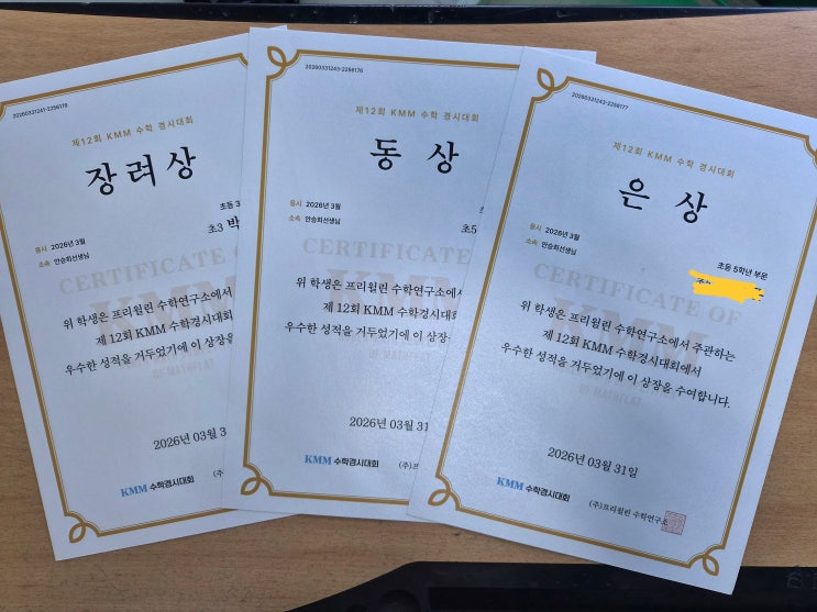 KMM 경시대회 처음시도라... 최상위 수업을 하는 친구들이 우선 도전해봤는데... 아파서 결석한 6학년 친구 한명을 빼고 3명 다 상을 탔네요. 축하해! 얘들아~^^ KMM은 매달 실시되는 경시라... 이달에는 더 많은 친구들고 함께 도전해보려고 합니다. #답십리 #동대문구 #천호대로 #전농동 #답십리수학학원 #전농동수학학원 #천호대로수학학원 #동대문구수학학원 #답십리수학교습소 #전농동수학교습소 #동대문구수학교습소 #답십리교습소 #전농동교습소 #동대문교습소#수학학원 #수학교습소 #교습소 #초등수학 #중등수학 #고등수학 #초등수학학원 #중등수학학원 #고등수학학원#답십리초등수학 #답십리중등수학 #답십리고등수학 #내신수학 #수학과....... <img src="https://blogthumb.pstatic.net/MjAyNjA0MDhfMTM0/MDAxNzc1NjEzODc5ODM0.L1tmLAlol3taiAcYTC5sOPhN7XqbNar7vvvXGcvSa7og.lO5pdV-t7Dhk1k755X7j8jvLh18c9mpsoeHgjtdBbQ0g.JPEG/KakaoTalk_20260408_105954894.jpg?type=s3" />