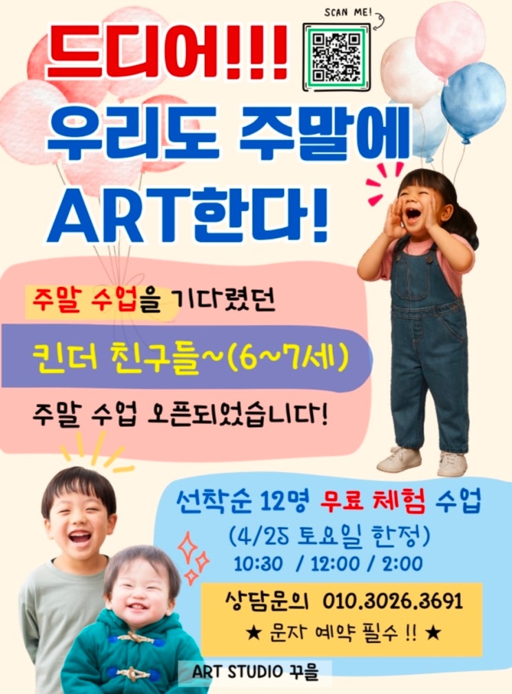 갑자기 날씨가 여름 같아요~♡ 일교차가 큰 날씨에 감기 조심하셔요~ 꾸믈의 10주년을 맞이하야~ 올해는 더 많은 이벤트가 준비될 예정입니다~♡ 그 첫 번째! 킨더 친구들을 위한 무료체험수업! 평소 유료로 진행되는 수업이지만 딱 12명의 친구들만 선착순으로 진행합니다. 10:30 / 12:00 / 2:00 꾸믈이 궁금했던 우리 유치부 6-7세 친구들은 문자 예약으로 신청을 받습니다. ✍️ 010.3026.3691 선착순 마감되므로 관심 있으신 분들은 서둘러 주셔요~♡ <img src="https://blogthumb.pstatic.net/MjAyNjA0MTZfMjM5/MDAxNzc2MzIxMjY2MTUx._tL0Jxp_GrSCwiLsdY1GcVhetHk3J-yT6idzjnMYLEAg.FN8mH4MOhTOy54S07l6EQrqX34ubOzgiQ81WEOgPFh8g.JPEG/900_1776321265260.jpeg?type=s3" />
