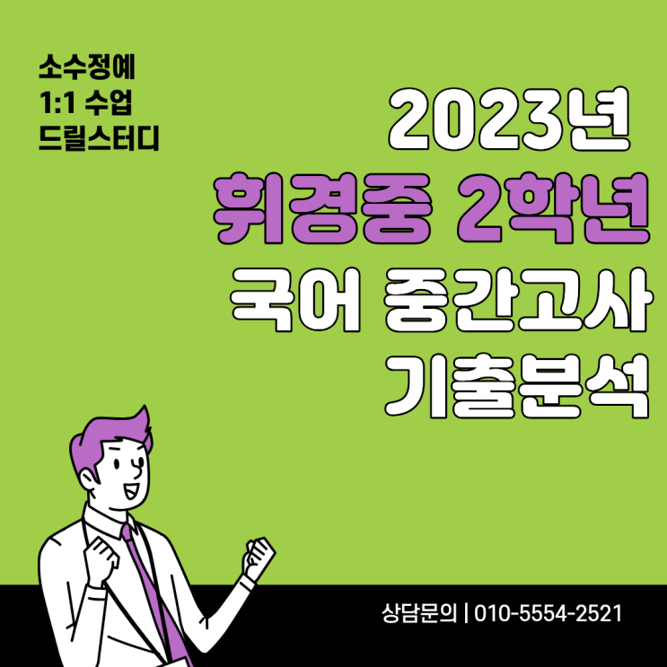 안녕하세요, 학생들의 성적 혁명을 주도하는 드릴스터디학원입니다. 오늘은2023년 휘경중2학년 국 중간고사기출 분석 자료를 가져왔는데요, 단순히 문제를 다시 풀어보는 것을 넘어, 출제자의 의도와 핵심 패턴을 파악하는 것이 1등급으로 가는 가장 빠른 길입니다. 드릴스터디만의 날카로운 분석으로 월계고 영어의 특징을 완벽하게 정리했으니, 이번 시험을 준비하는 학생들은 반드시 끝까지 주목해 주세요! 상담 문의는 언제든 010-5554-2521로 연락 주시면 친절히 안내해 드리겠습니다. ^^ 이번 휘경중학교 시험은 선택형 28문항으로 서술형 없이 모두 객관식으로 출제되었습니다. 배점이 큰 5점 문항이 총 4문항, 4점 문항이 총 11문항, 그....... <img src="https://blogthumb.pstatic.net/MjAyNjA0MThfNjAg/MDAxNzc2NDgxNzk3NzYy.PMsPxvGyOliAemdVt6zIRQ1oslXI6rdY6aHax7U76zMg.zY9OzvoEZ2ixGeh96WN-b6m_iDdsxBkVapZLSgQNMiUg.PNG/1.png?type=s3" />