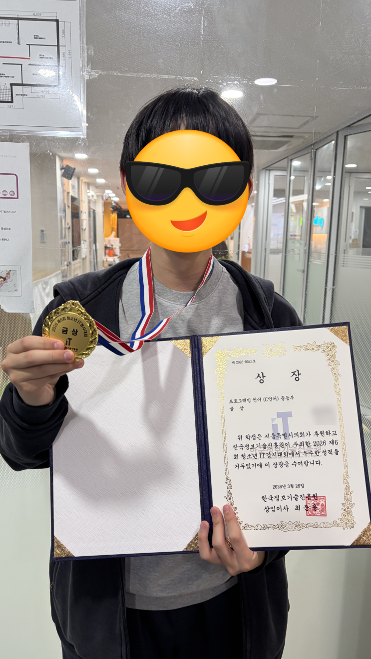 안녕하세요! 잇플코딩학원 입니다~^^ 앞서 전해드렸던 2026년 제6회 청소년 IT경시대회 C언어 부문 금상을 수상한 소식에 이어~ㅎㅎ 오늘 드디어 학교로 메달과 상장이 도착했습니다! 사진으로 보니 더 실감나네요^^ 금상을 받은 우리 학생은 초1부터 잇플코딩학원을 다니며 중2 현재까지 코딩을 배우고 있습니다. 단기간의 성과가 아닌, 오랜 시간 쌓아온 기본기가 이번 결과로 이어졌습니다~^^ 꾸준한 학습으로 쌓인 실력을 결과로 증명해준 우리 학생에게도 고마움을 전하며! 청출어람의 성장을 이어가길 응원합니다~^^ <img src="https://blogthumb.pstatic.net/MjAyNjA0MjFfMTc2/MDAxNzc2NzY4NDExNjc5.drWCGswzvopflVqFHFz9i9uQxBmYsR3gs9ErzyUF30Ig.YiE3tKJV4CZl4owqYyNJkYetfhcFqMe_HpbC14UBlUgg.PNG/image.png?type=s3" />