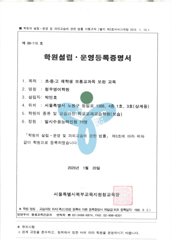 청우 운영등록증 및 교습비