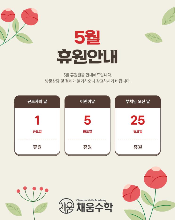 안녕하세요 마포채움수학과학입니다:) 다가오는 가정의 달, 5월을 맞아 5월 휴원 일정을 안내 드립니다. 5월 휴원 일정 5월 휴원일 : 5/1(금), 5/5(화), 5/25(월) 휴원일에는 방문결제 및 상담이 불가하오니 참고하시기 바랍니다. 즐거운 5월 보내세요! <img src="https://blogthumb.pstatic.net/MjAyNjA0MTRfMjU3/MDAxNzc2MTY2MzcwMTI3.wwVX6wy1g6DnUDf0nXoVQMrIM5j0ZbMYy08xW9BjBs8g.1TbyKRY04G6HhTu8ZgZWRrtXb95DUhPvKw9KEu7wNFYg.PNG/%BB%A1%B0%A3%BB%F6_%C0%CF%B7%AF%BD%BA%C6%AE_%B2%C9_5%BF%F9_%B0%F8%C8%DE%C0%CF_%C8%DE%B9%AB_%B4%DE%B7%C2_%C0%CE%BD%BA%C5%B8%B1%D7%B7%A5_%B0%D4%BD%C3%B9%B0.png?type=s3" />