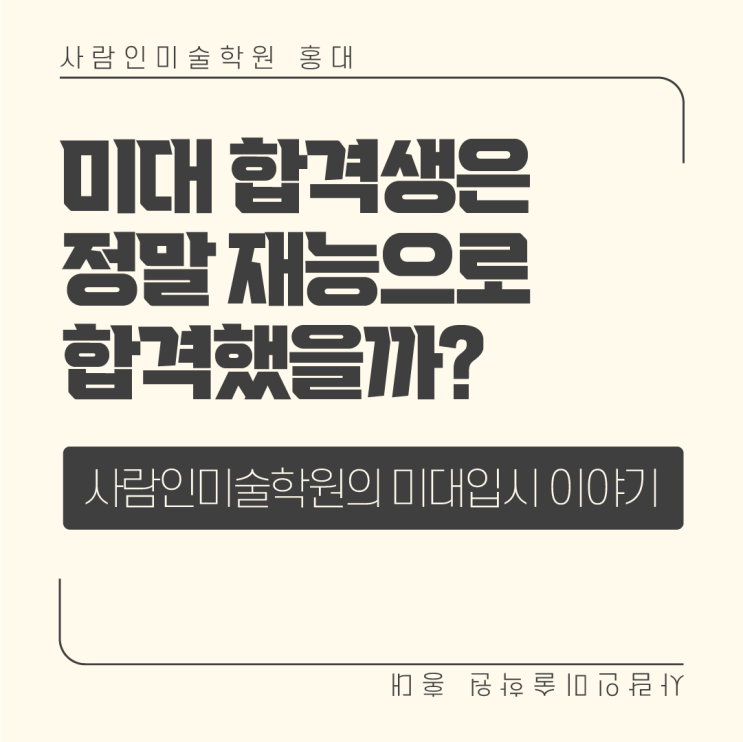 안녕하세요 홍대 앞, [회화과, 서양화, 조형예술, 한예종] 전문 사람인미술학원입니다. 미대입시 시즌이 돌아올 때마다, 저희 사람인미술학원 홍대점에는 같은 질문을 들고 찾아오시는 학생들과 학부모님들이 계십니다. "저희 아이는 재능이 부족한 것 같은데, 가능할까요?" 오늘 이 글에서는 미대입시 현장에서 수많은 합격생을 지켜봐 온 입장에서, 솔직하게 이야기해드리고 싶습니다. 학생들은 합격생에게 뭔가 다른 것이 분명히 있다고 생각합니다 "합격한 선배들 그림을 보면, 저는 절대 못 따라갈 것 같아요." 완성된 합격생 작품을 보면서 주눅이 드는 마음은 충분히 이해합니다. 그 그림들은 정말 단단하고, 흔들림....... <img src="https://blogthumb.pstatic.net/MjAyNjA0MjNfMjMw/MDAxNzc2OTM4Nzk3NTM5.W-sPx557JFTTDWkxfUmKs7VYIKDw9KGQrM8Kz6GAYUog.x3SeLvbCJn68ztVV1KJfksYcZVg57NnNpi9EUsfHDNog.PNG/%B9%CC%B4%EB%C0%D4%BD%C3_%C7%D5%B0%DD%BB%FD_%B9%CC%B4%EB%C0%D4%BD%C3%C7%D5%B0%DD_%C7%D5%B0%DD_%281%29.png?type=s3" />
