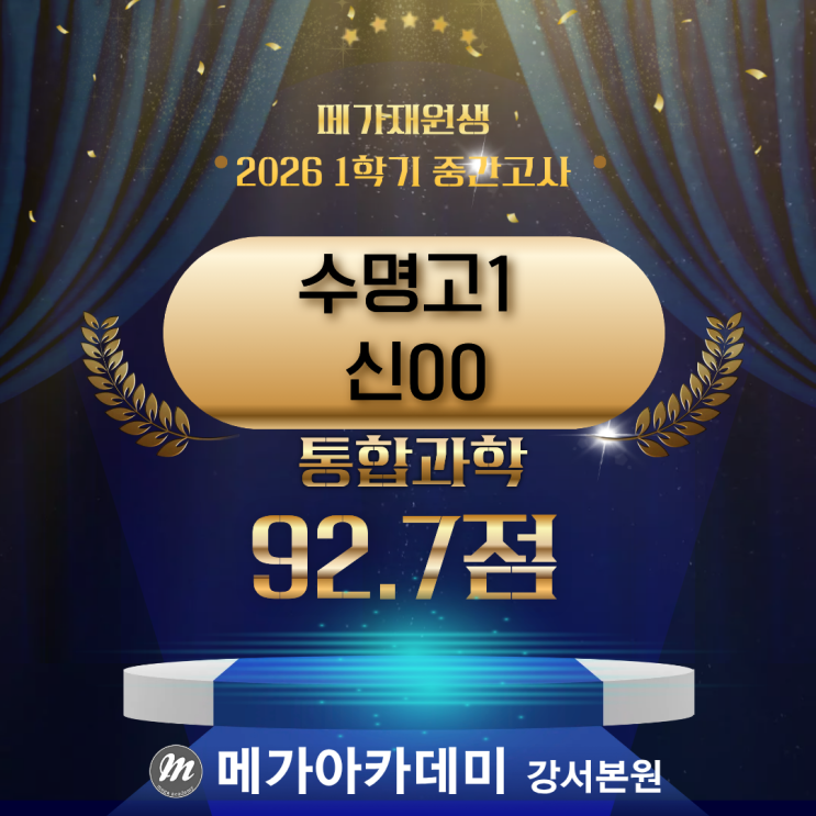 ✨ 중간고사 통합과학 92.7점 달성! 수명고 1학년 신○○ 학생을 축하합니다 ✨ 메가아카데미 강서본원 / 2026 중간고사 성적 인증 봄바람이 살랑살랑 불어오는 5월, 메가아카데미 강서본원에 기분 좋은 소식이 날아들었습니다 수명고등학교 1학년에 재학 중인 신○○ 학생이 이번 중간고사 통합과학에서 무려 92.7점이라는 빛나는 성적을 거두었습니다! 그 기쁜 순간, 담당 선생님과의 대화입니다 시험이 끝나고 담당 과학 선생님이신 김장안쌤이 조심스럽게 물어봤습니다. "메가 과학샘이야~. 시험 잘 봤어~?" 그리고 돌아온 학생의 대답은... "2개 틀렸습니다. 92.7이요." 선생님은 바로 다시 물었죠. &qu....... <img src="https://blogthumb.pstatic.net/MjAyNjA0MjdfMTYx/MDAxNzc3MjcyMTc0NDk0.Og_jiqyhYxnUJ70EvWKqpxQYL3j-RQtFwJhSCD6StLgg.T0dqu8VIooD1ufK3hA60g8y89PPVG0vUsbbLqvEVRmQg.PNG/%BC%BA%C0%FB%BB%F3%BD%C2_%B4%F6%BF%F8%BF%A9%B0%ED-_%BA%B9%BB%E7%BA%BB_%283%29.png?type=s3" />