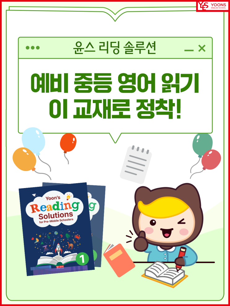 학년이 올라갈수록 읽기 교육이 중요합니다. 예비 중등의 영어 읽기와 독해는 어떻게 준비해야 할까요? 윤스리딩 솔루션 교재로 예비 중등을 준비하고 중등 읽기를 강화할 수 있습니다~! 고등영어에 들어가면 영어지문이 상당한 수준으로 어려워지기때문에 다양한 배경지식을 알고있으면 어려운 지문을 읽을때 큰 도움이 됩니다. 리딩솔루션 교재는 역사, 과학, 예술, 자연, 인물등 다양한 배경지식과 함께 아이들이 읽어도 흥미있을 주제들로 다루었습니다. 리딩 솔루션은 1. 읽기 전 질문을 통해 내용 추측을 가능하게 해줍니다. 2. 읽기 후, 글의 주제와 내용을 확인 할 수 있는 다양한 문제들을 풀어봅니다. 3. 요약글 작성을 통해 서논술형....... <img src="https://blogthumb.pstatic.net/MjAyNjA0MjZfMjI1/MDAxNzc3MTcwNjg1ODI3.Bx3wO8kUNouyxloYzbnZ-8aw534o_bYZlBJLCpv8dH0g.DIIOicQ5rTTxQ_lzuQr8_K5UDHuO3_-wSo2Jz_uAKXEg.PNG/1p.png?type=s3" />
