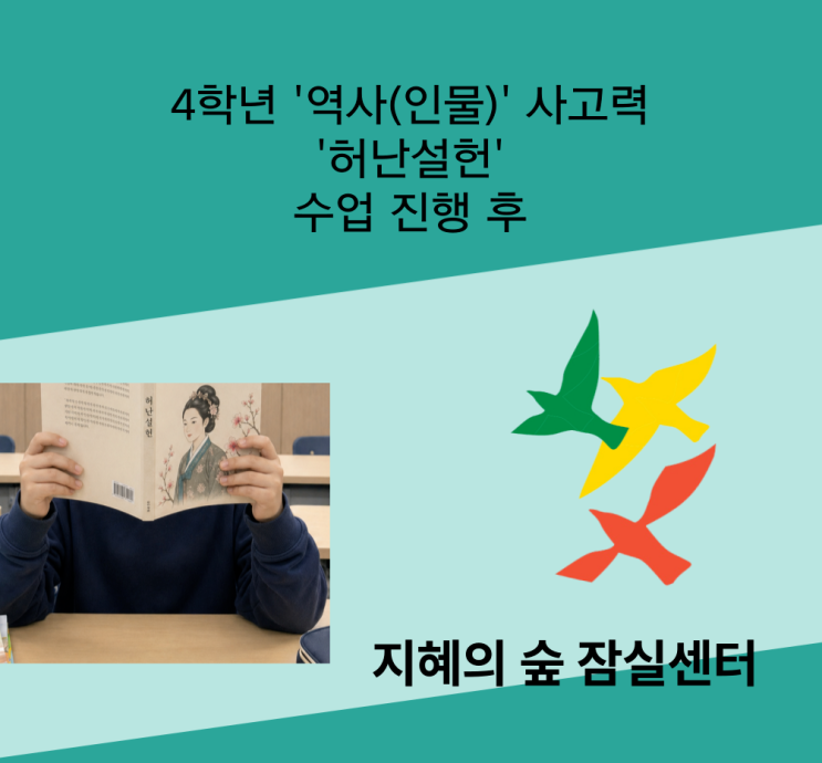 '허난설헌' / '역사(인물)' 사고력 수업 후 에세이 중 일부 발췌 / 지혜의 숲 잠실 글쓰기, 독서, 논술, 문해력 집안의 민들레 가을에 집안에서 태어난 작은 민들레 쑥쑥 자란다. 멋진 내 짝 민들레 아주 많은 양분 갑자기 불길한 느낌 겨울이 되었다. 시어머니의 차가운 시선 남편 짝 민들레의 허무맹랑한 생활 시어머니의 시집살이에 당하고 남편의 생활에 짓눌린다. 그래도 생명력이 강한 민들레는 꺾이지 않네. 계속 이어지는 하루 ...... 민들레가 점점 기울어진다. 힘을 잃네. 결국 민들레는 밟히고 마네. 하얀 그 꽃의 삶. 잘 버텨왔지만 27세의 꽃다운 나이에 영혼이 되네. <img src="https://blogthumb.pstatic.net/MjAyNjA0MjhfMTEw/MDAxNzc3MzQ3MjIxMDIw.kk3GIH5qOfO6GJvtQDkLLz4m9cIr0xQihdY98aP7HT8g.r01oNatKI8NC7idqM3o7wD0pNuwiHJo14v5zMVCJ3tUg.PNG/20260425-%BA%ED%B7%CE%B1%D7-009_%281%29.png?type=s3" />