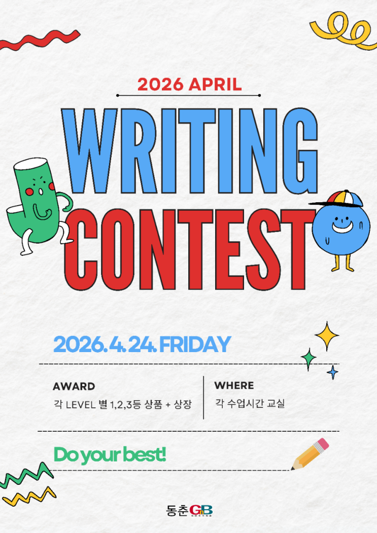 동춘지앤비 / 동춘수학 가디언스 & 가이스! 동춘동 영어학원 동춘지앤비 영어학원의 4월 이벤트는 Writing Contest 입니다. 단어도 잘 외우고 해석도 잘 하는데 영어로 글쓰기를 어려워해요. 많은 가디언스께서 말씀하십니다. 영어는 말을 해야 늡니다. 글은 손으로 써봐야 익혀집니다. 너는 생각하니? 나는 쓴다! 머릿속에 있는 영어 지식을 표현해보지 않으면 영어가 영원히 시험 과목으로만 남아 있습니다. 글을 쓸 때는 어떤 과정을 거쳐 표현해야 하는지 수업 시간에 배워보고 직접 써보니 한글로 쓰는 것도 쉽지 않다고 말 하는 동춘동 최고의 학생들이 되고 싶은 동춘지앤비 학생들이 말합니다. 각 반의 컨셉에 맞는 롸이팅 실력을 뽐....... <img src="https://blogthumb.pstatic.net/MjAyNjA0MjNfMTUy/MDAxNzc2OTQ4NjUxOTk2.nSuLaO0ZbdQDNGZ7cLWTKoIuzl16tVLkIkS9ZI4njfAg.JkClEgG7WCeQAPdkAQWmOUFSJuPm3lFlZ_FbiOB8rUcg.PNG/900_1776937539374.png?type=s3" />