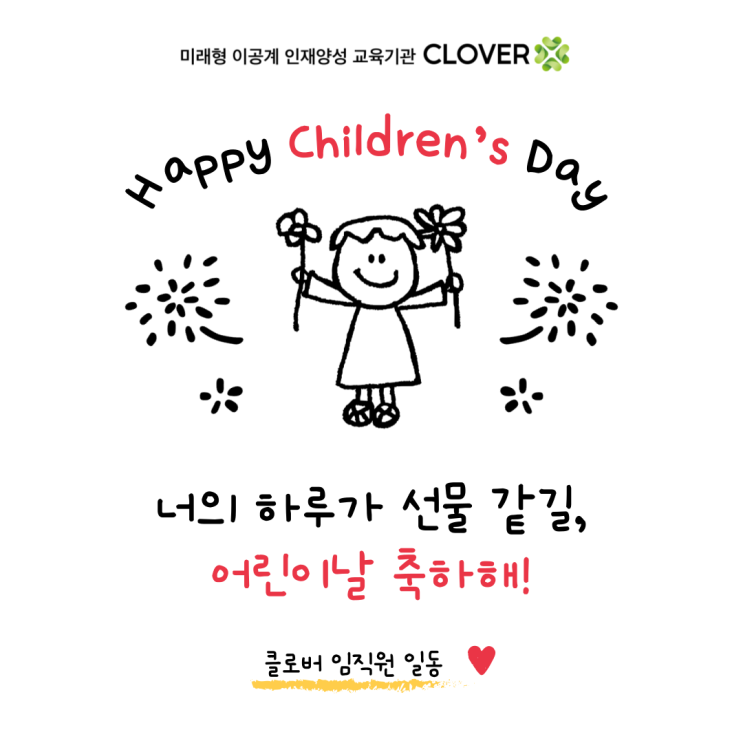 안녕하세요, 클로버학원입니다. 어린이날을 맞아 아이들에게 작은 선물을 전달했습니다. 아이들이 환하게 웃으며 기뻐하는 모습 덕분에 학원도 더 따뜻해지는 시간이었습니다. 어린이날 하루만큼은 공부는 잠시 내려놓고, 마음껏 웃고 즐기며 편안한 시간 보내길 바랍니다. 가정에서도 아이들과 함께 좋은 추억 많이 만드시길 바랍니다. 어린이날 진심으로 축하합니다. 클로버 임직원 일동 [가정의 달 연휴 휴무 안내] ■ 송도 본원 5월 1일 ~ 5월 6일 휴강 5월 7일 목요일부터 정상수업 진행 행정 업무는 5월 1일, 5월 5일만 휴무입니다. 주차 시작은 목요일부터로 변경되는 점 다시 한 번 꼭 확인 부탁드립니다. 일정에 착오 없으시길 바랍니다....... <img src="https://blogthumb.pstatic.net/MjAyNjA0MjNfMjYz/MDAxNzc2OTE2MjkzNzE3.vRNdknEkiW9uv-MxvUnVGaTKVKA271AH5BwBouSaHTUg.Miu7wIVb6V_zoAKSnpaPRmmRPv3GsdvZntfN4m4y9_Ag.PNG/2025-%BE%EE%B8%B0%C0%CC%B3%AF-%BC%B1%B9%B0%C0%CC%BA%A5%C6%AE-003.png?type=s3" />