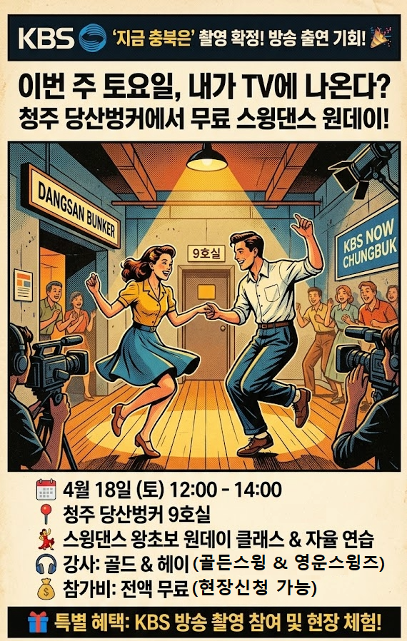 지난 주말 토요일 생방송 지금 충북은 에 골든스윙이 출연을 하였답니다! 동호회 회원분들과 원데이 클래스 수업하는 내용이었는데요!! 당산벙커에서 공연, 전시, 원데이 클래스 수업도 이뤄지는 내용이 오늘 4월 21일 화요일 생방송 지금 충북은 에 방송 되었답니다! 위링크로 다시 보기 가능합니다^^ 저도 간단한 인터뷰 했어용. #청주 #청주골든스윙 #골근스윙댄스 #스윙댄스 #지금충북은 #당산생각의벙커 <img src="https://blogthumb.pstatic.net/MjAyNjA0MjFfMTc0/MDAxNzc2NzgwMDQ2NDU0.3QL7wfPviJsue6XA1d8-xQbg8X8qL7gBE0t2gx7hqDAg.dV_DQxfiaW6HicFFg6U-xTW9YKPjYuirnKPZpXa1TRkg.PNG/IMG%A3%DF8637.PNG?type=s3" />
