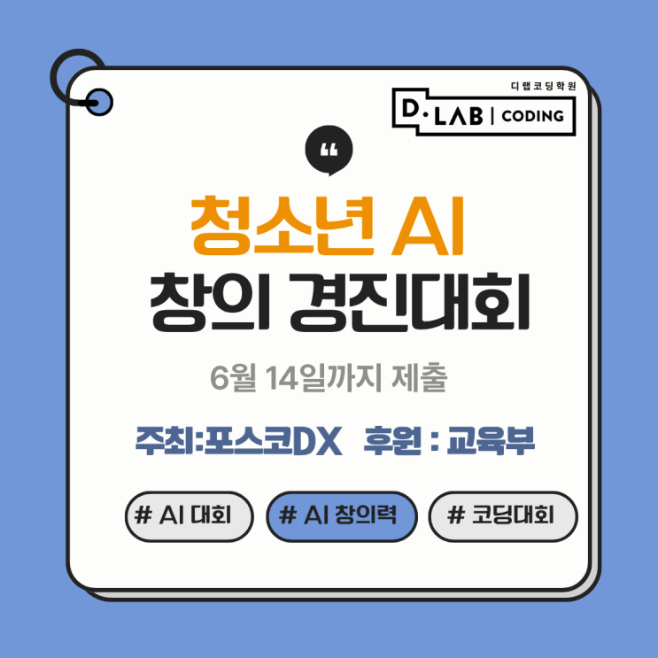 AI 시대, 우리 아이의 가능성을 시험해볼 기회! 대회 개요 제7회 전국 청소년 AI 창의 경진대회는 청소년들이 인공지능 기술을 활용해 창의적인 문제 해결 능력을 키울 수 있도록 마련된 전국 단위 대회입니다. 단순한 코딩 실력을 넘어서 아이디어 기획 AI 활용 능력 문제 해결 과정 까지 종합적으로 평가하는 것이 특징입니다. 대회의 핵심 목표 이 대회는 단순히 "코딩을 잘하는 학생"을 찾는 것이 아닙니다. ✔ 현실 문제를 AI로 해결하는 사고력 ✔ 창의적인 아이디어 설계 능력 ✔ 협업과 발표 능력 즉, AI 시대에 필요한 진짜 역량을 평가합니다. 참가 대상 전국 초·중·고등학생 개인 또는 팀....... <img src="https://blogthumb.pstatic.net/MjAyNjA0MjJfMTM1/MDAxNzc2ODQ4MzUzMDA4.ktAggofEpHFaTrUEcv1KCZ2Sn9JYhlELHQj_bC7x1P0g.JJVxaXEDkeSYRerEJBeaZoVZSaYH6V9pNvyrbUYxeYkg.PNG/%C6%C4%B6%F5%BB%F6%B0%FA_%C8%F2%BB%F6_%BD%C9%C7%C3%C7%CF%B0%ED_%B1%F2%B2%FB%C7%D1_%C1%A4%BA%B8_%C4%C1%C5%D9%C3%F7_%B5%F0%C0%DA%C0%CE_%B7%B9%C0%CC%BE%C6%BF%F4_%C0%CE%BD%BA%C5%B8%B1%D7%B7%A5_%C4%AB%B5%E5%B4%BA%BD%BA_%282%29.png?type=s3" />