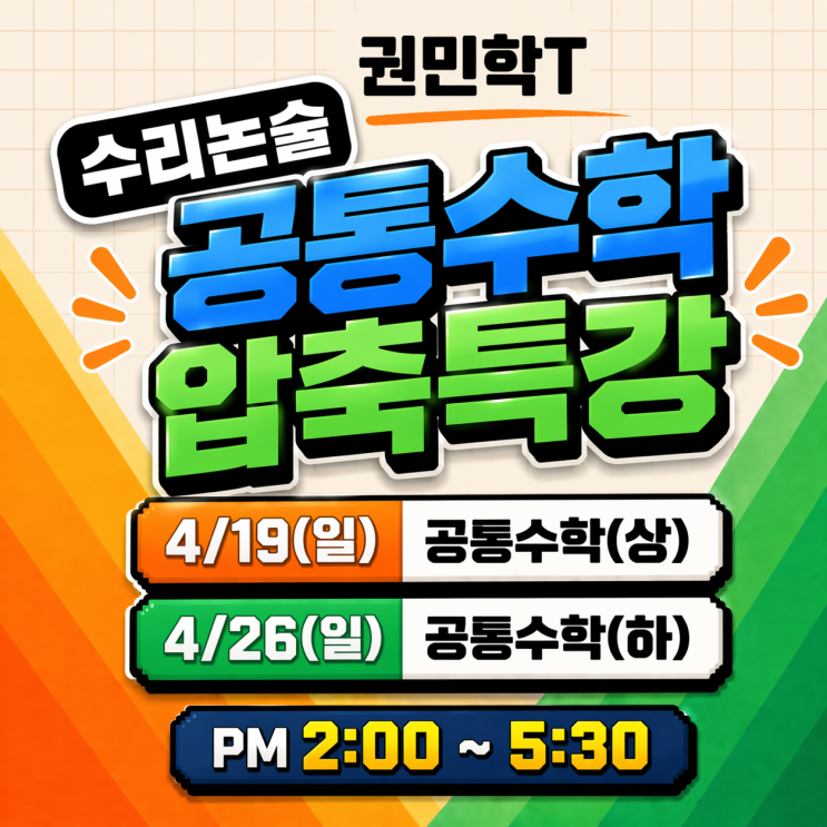 권민학T 내신휴강기간 수학1, 수학2 압축특강 일시 4월 19일 일요일 PM 2:00 ~ 5:30 4월 26일 일요일 PM 2:00 ~ 5:30 수강대상 - 연고서성한중경시이건동홍을 목표로 하는 학생 - 5월에 수리논술 시작을 생각하는 학생 - 수리논술이 어떤지 맛보기 수업이 필요한 학생 - 미적분 수리논술 전에 수1,2를 더 학습해야 하는 학생 권민학T 신규개강반 (미적분 위주) : 6월 개강 예정 강의특징 - 6월까지 권민학T가 복습테스트 답안지 직접첨삭 - 수리논술이 어렵지 않게 모두 이해할 수 있는 수업 - 수업 중간중간 클리닉을 통해 모든 학생들을 직접 파악 <img src="https://blogthumb.pstatic.net/MjAyNjA0MTNfMjMw/MDAxNzc2MDY4MDgyNjEz.hk8H91f-beJprkMi3DZdbF9tI7ov7aOD8F4VQoePDo8g.6RPGK7L-L3Qn_PDnfP5a5s3xPsjYtO17uYUA0TMqytsg.PNG/ChatGPT_Image_2026%B3%E2_4%BF%F9_13%C0%CF_%BF%C0%C8%C4_05_14_26_%281%29.png?type=s3" />