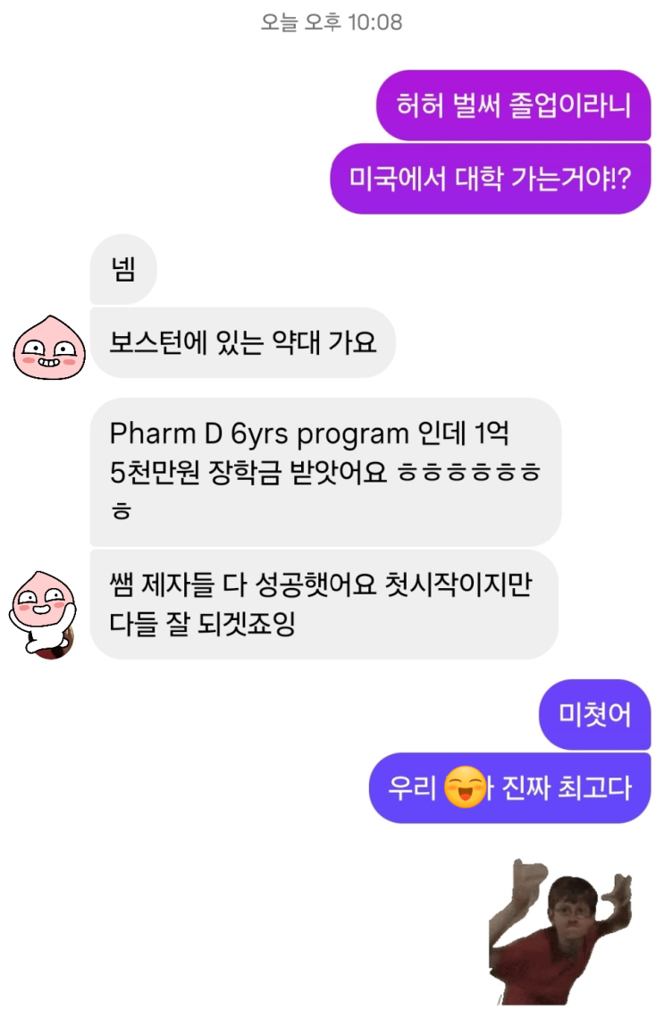 다니엘에듀케이션 졸업생들 안녕하세요 오늘은 조금 사적인 이야기를 하나 적어보려고 합니다. 요즘 슬슬 졸업 시즌이죠? 저희 다니엘에듀케이션은 분당 학원가의 중심인 태남프라자에서 6년째 학원을 운영해 오고 있는데요. 그동안 정말 많은 학생들을 가르쳐 왔습니다. 그런데 최근 6개월간 저의 제자들에게서 오랜만에 연락이 왔어요. 한 명이 아니라 하나둘씩 톡이 오는데, 그걸 보면서 괜히 하루 종일 기분이 들떠 있네요. 자기들끼리 연락하고 지냈는지... 다른 나라, 다른 지역, 다른 학교인데도 비슷한 시기에 연락이 오더라고요. 잊지 않고 연락을 준 것만으로도 저에겐 너무 고마운 친구들입니다. “선생님 저 이번에 ○○ 됐어요....... <img src="https://blogthumb.pstatic.net/MjAyNjA0MjFfMTk0/MDAxNzc2NzU1MzY0MjY1.ogsY2-TACpWLPzpsOJ2caQ36blLaisJuW3ei-29WUVsg.GkSuFdFzY9zdI3oMg42XAibtXUrZlz5AS6HAmr3_dAwg.PNG/image.png?type=s3" />