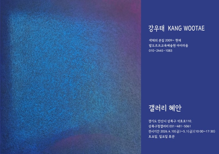 강우태 칠판분필화 전시회 2026년 4월10일~5월1일{토,일은 휴무} 장소 : 갤러리 혜안(안산시 상록구청 1층 전시실) 강우태 작가님이 몇개월 동안 전시를 준비하면서 마주한 어려움과 새로운 경험을 모았습니다. "정신적인 것은 사유되는 것이 아니라 지각되는 것으로 실제적인 행위로 이루어진다." 몇년동안 칠판그림을 그리는 과정속에서 조금씩 변해가는 길에서 요즘 하고 있는 작업관입니다. 고형화된 분필은 칠판과 만나면서 차원이 없는 점으로 형성됩니다. 색의 점들이 끊임없는 변형을 통해 모호함과 알수없는 새로운 공간을 만들어내는 작업입니다. 색은 서로 다른 색과의 관계를 통해서 매번 다양한 의미를 드러냅니다. 18작....... <img src="https://blogthumb.pstatic.net/MjAyNjA0MjVfMTgw/MDAxNzc3MTE2NTQxNDc5.vMl7n2hYwd-mmT01ITq0tOFsV7Xoqx9CV9VFb0zsf6Mg.akYCrmY6YOXD0cNM4u3PnTLl6CqeewW-AYflj2rSz-Mg.JPEG/i_7hgUd018svcaxr63ikoye0l_xg8un.jpg?type=s3" />