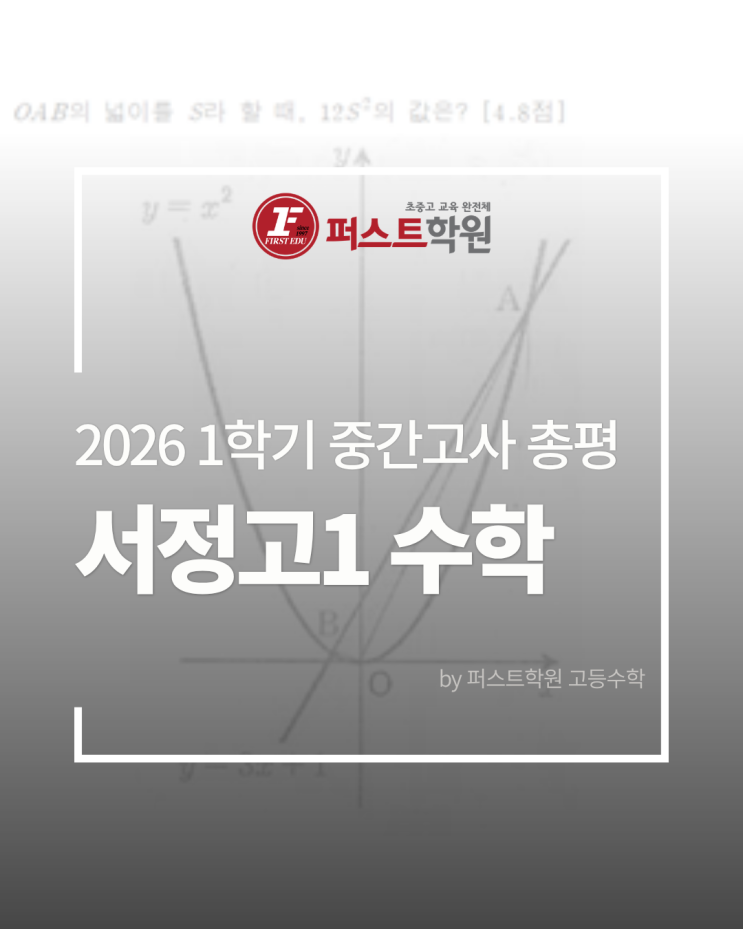 지난 4월 23일, 서정고 1학년 1학기 중간고사 수학시험이 시행되었습니다. 서정고1 수학 1학기 중간고사는 교과서 위주로 대부분의 문항을 출제하되, 2~3문제 정도에서 변별력을 가르기 위해 고난도 문제를 출제하였습니다. 고난도 문제조차 익숙한 유형의 문제들이 많아 실수가 적고, 많은 문제를 풀어본 꼼꼼한 학생이 매우 유리한 형태의 시험입니다. 2026 1학기 중간고사 서정고1 수학 출제 구성 ▽▽▽ 객관식 20문항 서술형 2문항 객관식 17,18,20번, 논술형 2번 : 변별력 문항 몇몇 주요 문제들을 살펴보면 16번 문항은 이차함수와 이차방정식 사이의 관계, 그 안에서 이차함수의 최대, 최소까지 종합적으로 묻는 문제입니다. 17번 문항의....... <img src="https://blogthumb.pstatic.net/MjAyNjA0MjVfMTQ0/MDAxNzc3MDg0MTM4OTc2.rteB5WkBJ9FeSDN1tftpU91XlbtqcKcUypdWA6pg9GUg.RmkD-JWOKVGb8aLPfMzCDqYaP-jPOeaAMtUvC4q0YP0g.PNG/7.png?type=s3" />