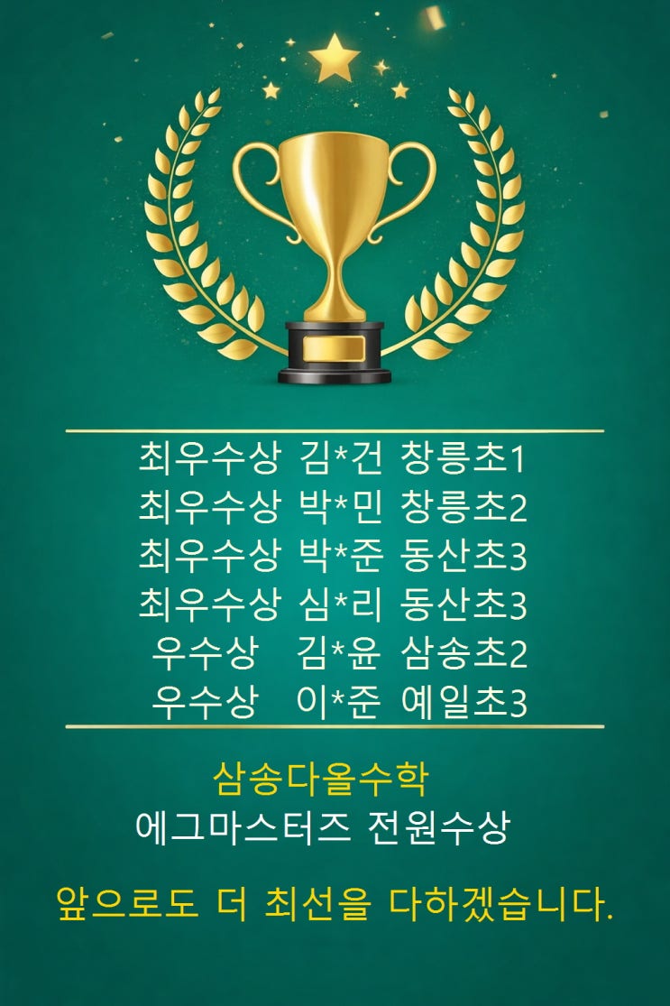 평소 실력이 만든 값진 결과! 이번 에그마스터즈에서 우리 아이들이 전원 수상이라는 정말 멋진 결과를 만들었습니다~ 이번 수상은 단기간 준비로 만들어진 결과가 아니라, 평소 에그연산 문제집으로 꾸준히 공부해 온 힘이 그대로 나타난 결과라 더욱 의미가 큽니다. 매일 차근차근 연산 실력을 쌓고, 틀린 문제를 다시 확인하며 성실하게 노력한 우리 아이들, 정말 대견하고 자랑스럽습니다. 그리고 아이들이 꾸준히 공부할 수 있도록 옆에서 응원해주신 부모님들께도 큰 박수를 보냅니다 아이들의 노력과 부모님의 응원과 기다림이 최우수상과 우수상으로 빛나는 결과가 되었습니다. 이번 결과는 함께 만들어낸 값진 성장의 결실입니다. 앞으....... <img src="https://blogthumb.pstatic.net/MjAyNjA0MjBfMTcz/MDAxNzc2NjQ5MjUwNTk0.vGmG2DI95T2zPCZvPbYyVsUs3L0Y-6xYrhEeor0tNlIg.weqpVrmzDCH27LyI1I59cqAFR16vRrfcYc2HefC0_nMg.JPEG/%B3%EC%BB%F6%B9%D9%C5%C1%BF%A1%B1%D7%B8%B6%BD%BA%C5%CD%C1%EE_%BC%F6%BB%F3.jpg?type=s3" />