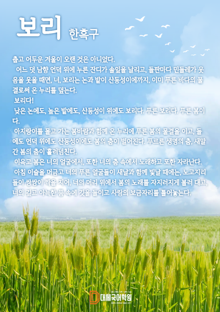 안녕하세요.대세국어학원입니다. 매달 한 편의 문학 작품을 함께 읽고 감상하며 감성적인 사고력과 상상력을 자연스럽게 키워나가는 문학작품 소개코너입니다. 푸른잎이 유난히 더 푸르러지는 5월입니다. 햇빛가득한 날들이 이어지면서 너나 할 것 없이 녹음이 우거지기 시작했습니다. 꽃들이 지면서 푸르름이 돋보이는 나무들을 보면 겨우내 앙상하던 가지가 무성해짐을 느끼며 느리지만 해마다 묵묵히 자라나는 것을 실감하게 됩니다. 이번 달의 문학작품은 봄의 성장을 느끼게 하는 시 한흑구의 <보리> 입니다. 시 속에 깃든 의미를 되새기며, 자녀분들과 마음을 나누는 시간이 되기를 바랍니다. ☎ 상담 예약 및 문의사항 ** 대세학원....... <img src="https://blogthumb.pstatic.net/MjAyNjA0MjNfMjAz/MDAxNzc2OTI0NjI4ODEz.1PMqWDBLg8HLXp93tRPDNq1H1pQ9_tV741tQ7Aw44Jcg.rWrhWmWeu6ZVo7AKNMfj6A1jQFgGbutTrOwYDTCyuiYg.PNG/1.png?type=s3" />