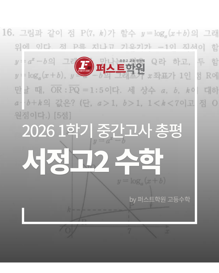 2026년 1학기, 본격적인 중간고사 시즌입니다. 이번 퍼스트 고등수학 내신총평의 스타트는 '서정고 2학년' 1학기 중간고사 결과입니다. 지난 4월 22일에 실시된 이번 서정고 2학년 1학기 중간고사 수학시험은 객관식 20문항과 논술형 2문항이 출제되었습니다. 2026 1학기 중간고사 서정고2 수학 출제 구성 ▽▽▽ 객관식 20문항 논술형 2문항 객관식 19번, 20번 준킬러 문항 16번(2022학년도 고3 9월 평가원 21번)과 19번, 20번을 제외한 대부분의 문항이 평이하였고, 교과서와 퍼스트학원 본원 시험 대비 교재를 벗어나는 신유형은 없었습니다. 실수가 적고, 꼼꼼한 학생이 매우 유리한 형태의 시험입니다. 계단식으로 난도가 올라가....... <img src="https://blogthumb.pstatic.net/MjAyNjA0MjNfMjYg/MDAxNzc2OTM0ODQ3Nzg2.eO2oeKJOFQujqdt8_BYtBOC1-JWE8wcOh5JywA6BPFog.Z3Jiy4KBmNUVJPvjCDsru35uLZel5r-jtqlrgPHqivQg.PNG/%BC%AD%C1%A42.png?type=s3" />