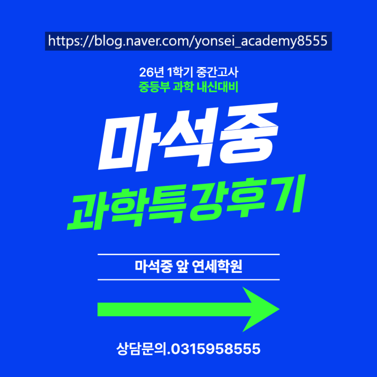 안녕하세요, 연세학원입니다~ 이제 마석 지역 중고등부 시험 기간이 끝을 향해 가고 있네요. 아이들도 선생님도 지쳐가는 시기이긴 해요!! 하지만!! 쌤들이 먼저 지칠 순 없죠!ㅎㅎ 오늘은 이번 마석중3들을 위한 주말 과학 특강이 어떤 결과를 보였는지 알려드립니다~ 주말 특강으로 과학 50점 올리기 성공! 저희 마석중 앞 연세학원이 마석고 심석고 보내기 프로젝트 중 하나로 중간고사 대비 과학 주말 특강을 열었었죠! 4주 간의 짧지만 아주 강력한 특강을 마치고 드디어 어제 시험이 있었습니다. 매수업 진도를 나가면서 복습을 병행했고 그러다보니 마지막 진도 수업에는 전 범위 설명을 다 하고 있었다는,,,ㅎㅎ 아이들이 알고 싶어 하고....... <img src="https://blogthumb.pstatic.net/MjAyNjA0MjlfNTkg/MDAxNzc3NDQxMTM5NjMz.5wf48tdZWWfh2btSqA6AOkdoWJlVEgtn-AEJu8z4yz8g.Ra0_dKGUFRG9JMMytqC7eNheS8FyT0vp13yGrAG1V8Yg.PNG/%B8%B6%BC%AE_%B0%FA%C7%D0_%C1%D6%B8%BB_%C6%AF%B0%AD.png?type=s3" />
