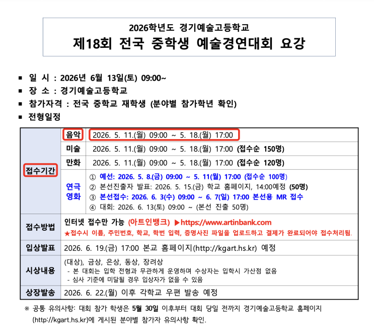 안녕하세요. 피아노와 작곡을 수업(레슨) 하는 시흥시 은행동 은계단지(지구)내에 위치한 온유어 음악교습소 원장 '나비'입니다. 2026 경기예술고등학교 중학생 예술 경연대회 모집요강 음악 부문 - 피아노,작곡 접수기간 및 접수방법 <접수기간> 2026. 5. 11 월요일 09:00 ~ 5. 18 월요일 17:00 <접수방법> 인터넷 접수만 가능 아트인뱅크 <입상발표> 2026. 6. 19. 금요일 17:00 경기예고 홈페이지 예정 http://www.kgart.hs.kr/ <시상내용> 금상, 은상, 동상, 장려상 -본 대회는 입학전형과 무관하게 운영하며 수상자는 입학시 가산점 없음 -심사 기준에 미달될 경우 입상자가 없을 수 있음 대회 종목 및 세....... <img src="https://blogthumb.pstatic.net/MjAyNjA0MjFfMjcy/MDAxNzc2NzcwNzg3ODU5.hUZ5qPcLG9-HCv18Ck-kEen9fNEouYl20yjqNLEujIcg.XEOWctpYqTmgrmqR8mpw4d2fXZagSay4gcJNUh0fEhQg.PNG/image.png?type=s3" />