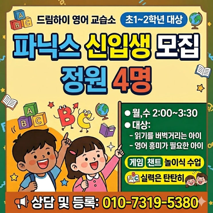 안녕하세요! 아이들의 영어 자신감을 책임지는 드림하이 잉글리쉬 Stella 원장입니다. 영어를 처음 시작할 때 가장 중요한 것은 ‘공부’라는 거부감 없이 "나도 읽을 수 있다!"는 성취감을 맛보는 것입니다. 파닉스를 한 번 뗐는데도 여전히 단어 앞에서 주춤하는 아이, 영어 학원 가는 걸 숙제처럼 느끼는 아이들을 위해 드림하이만의 특별한 파닉스 반을 소개합니다. 이런 고민을 하시는 학부모님께 추천합니다! "파닉스를 배웠는데도 읽기를 버벅거려요" "영어 공부하는 걸 너무 싫어해요" "초등 저학년, 첫 시작을 제대로 하고 싶어요" ✨ 드림하이 파닉스 반의 '탄탄한' 수업 구성....... <img src="https://blogthumb.pstatic.net/MjAyNjA0MjNfNTcg/MDAxNzc2OTI4MTM1NDQ4.uZUVmMYIFNyVEtE0j6JgCNCvxyFRv2Zm5R6Vd9gfbXsg.oJUrbgL66n6hDZUuXQkM7eSJaFnq5y8KLqwgb0ttzPMg.JPEG/76e0a74a-28e8-442e-8549-e9c84a818d9f.jpg?type=s3" />