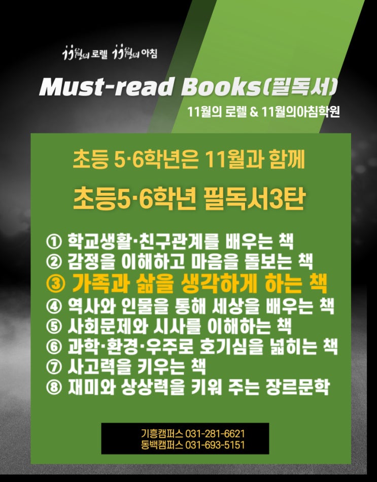 안녕하세요 용인 기흥구에 위치한 11월의로렐학원&11월의아침학원입니다. 오늘은 용인 기흥구에 위치한 상하초·동백초·한얼초·동막초·중일초·갈곡초·동막초 학생들을 위해 초등학교 5,6학년, 지금 읽으면 좋은 책들 8개 주제로 필독서를 안내해 드리도록 하겠습니다. 오늘은 3번째 시간으로 '가족과 삶을 이해하게 되는 책'에 대한 내용을 정리해드리도록 하겠습니다 가족과 삶을 생각하게 하는 책 가족과 삶을 생각하게 하는 책 초등학교 5학년, 6학년이 되면 아이들은 가족을 조금 더 깊은 눈으로 바라보기 시작합니다. 어릴 때는 당연하게 느껴졌던 가족의 존재가, 점점 더 많은 감정과 의미를 가진 관계로 다가오기 때문입니다....... <img src="https://blogthumb.pstatic.net/MjAyNjA0MjZfMjQw/MDAxNzc3MTk1NjE3NDI3.LIUnYlSrc-Qp_QO51jg0-YMRbEc5jmeSOXmqhstvAF0g.Lp__9v4e51BgfAen9RwsKVXb5pmc6JSQosqwOPWbwcsg.JPEG/001.jpg?type=s3" />