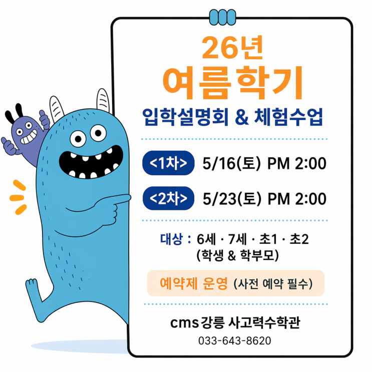 ▶설명회 및 체험수업 일정 <1차> 5/16(토) PM 2:00 <2차> 5/23(토) PM 2:00 -대상 : 6세 · 7세 · 초1 · 초2 (학생 & 학부모) *체험수업 참여비 1만원발생( 재원생 형제자매일 경우 제외) ※ 예약제로 운영 (사전예약 필수) -유선예약 033 643 8620 또는 구글폼 작성 개별입학상담 또는 진단평가 예약은 (아래) 크레버스 클릭 cms강릉 사고력수학관 033 643 8620 <img src="https://blogthumb.pstatic.net/MjAyNjA0MjNfMjQ0/MDAxNzc2OTM2MTQxMzEx.1k8C702nv1hirDrxa1kDi03jMk7xnTgSZb_RnNiNrhgg.QFU8V6q_CJoOcpL6E30QdqtQBi6bfaKjuCoo60zwoVgg.PNG/%BF%A9%B8%A7%C7%D0%B1%E2_%BC%B3%B8%ED%C8%A3%2C_%C3%BC%C7%E8%BC%F6%BE%F7.png?type=s3" />