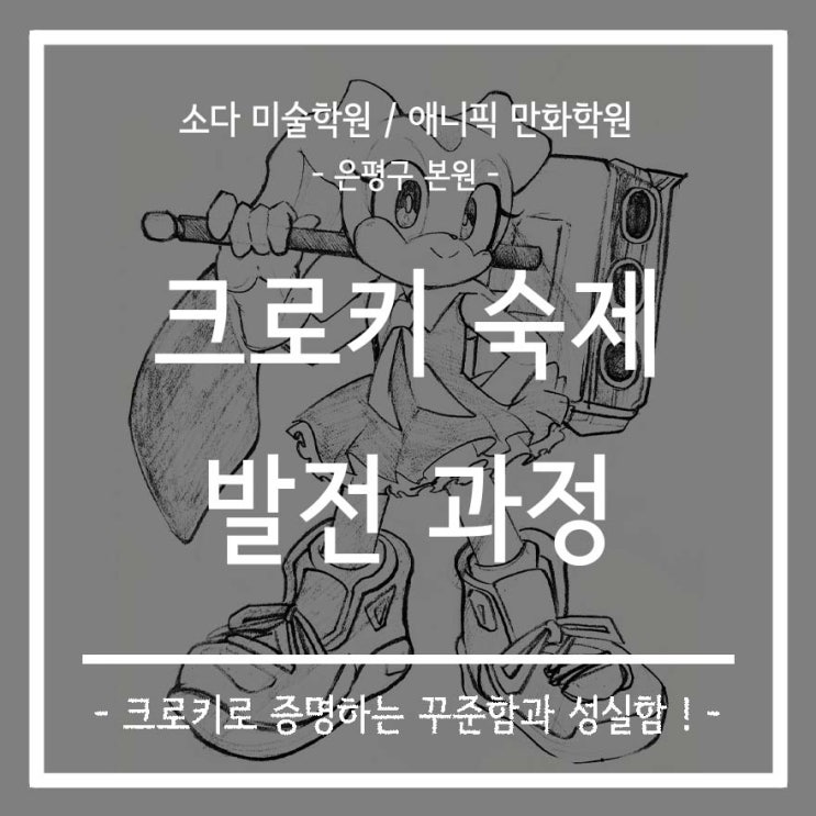 안녕하세요~ 서울 은평 미술학원 응암 만화 애니 학원 소다 미술학원 / 애니픽 만화 학원입니다! 벌써 4월도 얼마 남지 않았는데요! 곧 중간고사도 다가오고, 시간이 너무 빠르게 지나가고 있어요. 우리 이 시간을 알차게 써보자고요♥♥ 오늘 소개할 것은 <크로키 숙제 발전 과정>입니다. 이 학생은 숙제를 굉장히 열심히 해오는데요! 숙제를 꾸준히 하는 만큼 실력도 많이 성장한 학생입니다. 이 학생도 처음에는 숙제의 필요성에 대해서 잘 몰랐다고 해요. 그래도 '숙제는 꼭 해야만 하는 것'이라는 생각을 가지고 있었기 때문에 크로키를 매일매일, 꾸준히 진행했습니다. 숙제를 해오면 선생님들이 적어주고, 수정해 주는 피....... <img src="https://blogthumb.pstatic.net/MjAyNjA0MjJfMTQz/MDAxNzc2ODM2ODAzNTcz.WfRaEc69XwUIIuff8dinURzQ_ybTzb64nfwhdjbPHSIg.7Ir9tOCzzbKprbT7s79pI3tOnGajUs9ZAIIX-iWKuk4g.JPEG/0422_%B4%EB%C7%A5%C0%CC%B9%CC%C1%F6.jpg?type=s3" />