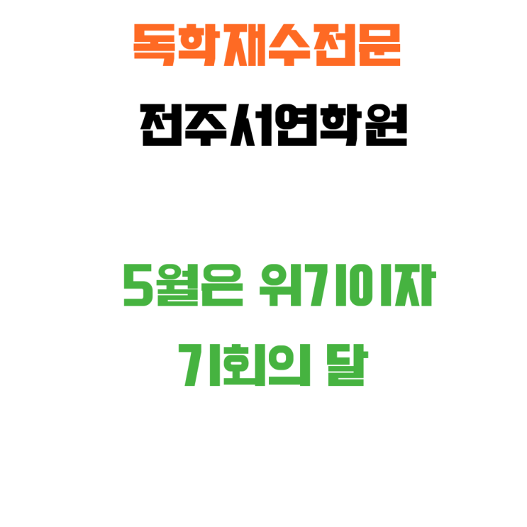 안녕하세요 #전주재수학원 #전주독학재수학원 #전주서연학원 입니다 수험생에게 5월은 위기이자 기회의 달입니다. 많은 학생들이 풀어지고, 공부 안 하면서 불안감을 많이 느끼는 시기입니다. 이럴 때 수능 본질에 맞게 공부하면 6모를 치고 나갈 수 있습니다. 독학재수전문 전주서연학원의 강점은 항상 위기를 기회로 만들 줄 안다는 점입니다. 서연학원생은 5월에도 흔들리지 않고, 열심히 공부하여 6모에서 좋은 성적을 낼 수 있도록 아래와 같은 편지를 써서 학생들에게 나눠주면서 학습방향과 태도를 바로 잡아주었습니다. 5월은 위기이자 기회의 달입니다. 중요한 6모를 앞두고 단순하게 열심히 하지 않으면 불안해집니다. 또 휴일도 많아....... <img src="https://blogthumb.pstatic.net/MjAyNjA0MjhfMTU1/MDAxNzc3MzY0NDM3MDU2.Ab-OMZq42s6P2VNzn-i3mCXxi5mIiavXVipFbmp4sYwg.idy-xuXI4cKNU4IES2L1_krDoheN8rPrTWdPDMeSS3Yg.PNG/Never_give_up_instagram_post__%2825%29.png?type=s3" />