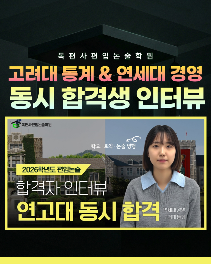 고려대 통계학과 편입, 연세대 경영학과 편입 동시합격생 등장!?합격수기로 증명! 안녕하세요. 독편사편입논술학원 입니다. 오늘은 연고대편입을 꿈꾸는 수험생분들에게 희망이 될 만한 특별한 합격 스토리를 가져왔습니다. 고려대 통계학과와 연세대 경영학과에 모두 합격한 '2관왕' 주인공의 비결을 공개합니다. 자기소개 새로운 도전에 나서다 이번 인터뷰의 주인공은 평소 학점은 성실히 관리해 왔지만, 인턴이나 대외활동 등 눈에 띄는 스펙이 없어 고민하던 평범한 대학생이었습니다. 자신의 미래를 위한 가장 확실하고 강력한 스펙은 '고학벌'이라는 결론을 내리고, 독편사편입논술학원에서 본격적으로 연고대편입 준....... <img src="https://blogthumb.pstatic.net/MjAyNjA0MjdfNzgg/MDAxNzc3MjczMDk0MzQz.EeG6iszKUJl3glEXq9fjSHqjYvXe7D-MUjBA2GpOhFIg.oxAEK7i_ViX2tL6GOg_DY3odOzwEb4n7WEw5raS7A3Yg.PNG/1.png?type=s3" />