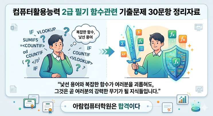 안녕하세요. 컴퓨터자격증다따네! 아람컴 아람돌이입니다. 컴활 2급 필기 공부하시는 분들께 조금이나마 도움이 되었으면 좋겠습니다. 아람 컴퓨터학원에서 특강 수업 시 엑셀 부문 설명할 때 드리는 함수 관련된 기출문제 자료 중 일부입니다. 문제 아래에 해답과 설명까지 직접 입력해 놓은 자료입니다. 엑셀 20문항 중 함수 관련 문제가 적으면 2문제 많으면 4문제까지 출제되는 경우가 있는데 다양한 함수 명령 통해 점수에 도움이 되었으면 좋겠습니다. 그리고 이 블로그 컴퓨터 자격증 카테고리 가시면 함수 관련된 과연도 문제 자료도 올라가 있으니 검색해 보시고 다운로드해서 공부하시길 바랍니다. 더 필요한 자료가 혹시 있으시면 메....... <img src="https://blogthumb.pstatic.net/MjAyNjA0MjFfNjcg/MDAxNzc2NzM5NTg2MzI0.kgGUxJDG81mGia8PXZDubVscb-j73FFryHTTO_6P4b0g.UjZ3m5x0SiCxZzx94h076fajCr3fHSDVXBhDmwlebgsg.PNG/Gemini_Generated_Image_6d4vme6d4vme6d4v.png?type=s3" />
