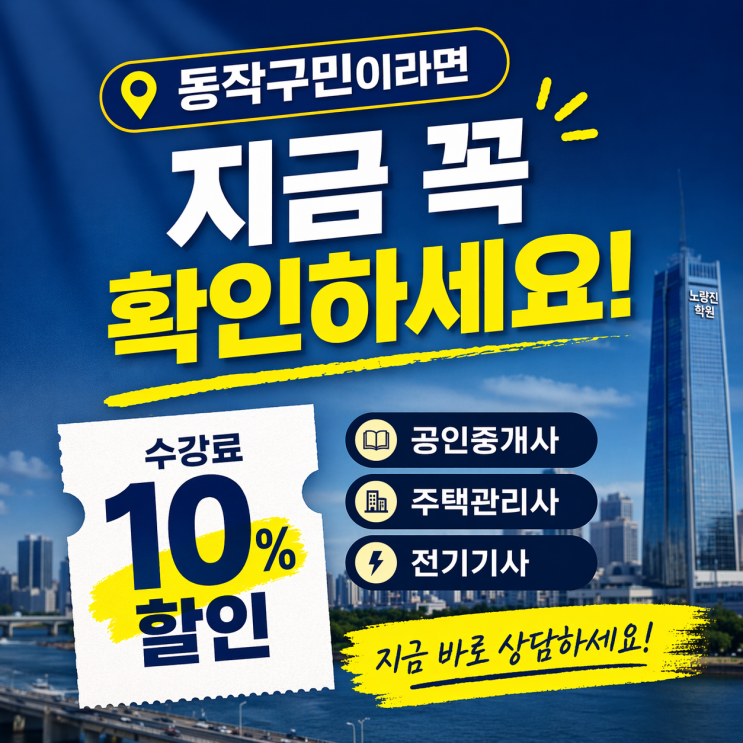안녕하세요. 에듀윌 자격증 노량진학원입니다 :) 혹시 지금 이 글을 보고 계신 분, 동작구에 거주하고 계신가요? 그렇다면, 이번 기회는 그냥 넘기시면 안 됩니다. ✔ 동작구민이라면 10% 할인 현재 저희 에듀윌 노량진학원에서는 동작구민 대상 수강료 10% 할인 혜택을 진행하고 있습니다. ✔ 공인중개사 ✔ 주택관리사 ✔ 전기기사 자격증 준비를 고민하고 계셨다면, 지금이 시작 타이밍입니다. ✔ 왜 지금 시작해야 할까요? 솔직하게 말씀드리면, 자격증 공부는 “언젠가” 시작하면 늦어집니다. 특히 공인중개사, 주택관리사는 준비 기간이 길고 누적 학습이 중요한 시험이기 때문에 하루라도 먼저 시작한 사람이 유리합니다. ✔ 이런 분....... <img src="https://blogthumb.pstatic.net/MjAyNjA0MTdfMTcy/MDAxNzc2NDAzMTM4NTU5.obG_9wMgz7yDUAo5NTtF2867fnw1UFD9949JB9jmV28g.iJQqZiIvYOtGSkEgkCYN__B9iHTXf0Y0ZRTZDeepUT8g.PNG/ChatGPT_Image_2026%B3%E2_4%BF%F9_17%C0%CF_%BF%C0%C8%C4_02_18_41.png?type=s3" />