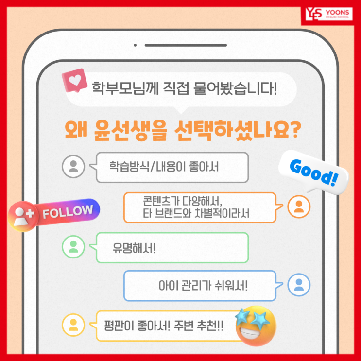 왜 윤선생을 선택하셨나요?" 윤선생을 선택한 학부모들에게 직접 물어봤습니다. "학습방식/내용이 좋아서!", "콘텐츠가 다양하고 타 브랜드와 차별적이라서", "유명해서!", "평판이 좋고, 주변 추천으로!" 간혹 상담하고 등록할때 학부모님들이 "저도 어렸을때 윤선생으로 영어했어요~!" 하시는 분들을 종종 뵙니다. 본인도 하시고, 우리 아이까지 윤선생을 선택하신 이유가 있겠지요? 윤선생은 유아에서부터 고등까지 50년동안의 커리큘럼이 탄탄합니다. 지금도 끊임없이 교재를 개발하고 현장에서(교습소와 학원등)의 피드백을 실시간으로 듣고 반영합니다. 심지어 파닉스는 유치,초등....... <img src="https://blogthumb.pstatic.net/MjAyNjA0MTdfNzAg/MDAxNzc2NDAxNzM4NTY0.UA2KEOS825AKNU_f-WzDo12Jf3ut-Swx8ddS1owEMDsg.9C8BJHhYuMaSmFwZNwuYNTdyMGjuceKwg-v3lTDXktEg.PNG/8%C1%D6%C2%F7_01.png?type=s3" />