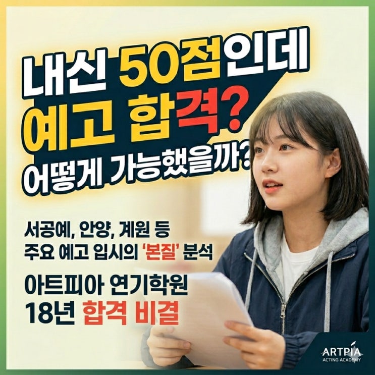 이 글을 보고 계신 분이라면 행운이십니다 전국에서 예고 입시를 가장 잘하는 아트피아 연기학원 대표 전경배입니다. 서울공연예술고등학교(이하 서공예) 안양예고, 계원예고, 국립전통예고 고양예고, 경기예고 합격을 원하시는 학부모님들과 상담을 하다 보면 “우리 아이 내신이 00점인데 원하는 예고에 합격할 수 있을까요?” 라는 질문을 자주 받습니다. 3년 전까지만 해도 많은 연기학원에서는 “예고 입시는 성적보다 실기가 중요하다” 라는 이야기를 많이 했습니다. 하지만, 아트피아는 달랐죠. 내신 점수가 합격의 당락에 영향을 준다. 실제 예고에 합격하는 학생들을 통해서 학교별 내신 최저 점수를 파악했고 200점 만점 중에 1xx....... <img src="https://blogthumb.pstatic.net/MjAyNjA0MjVfMjc3/MDAxNzc3MTEzNzQ1ODE1.zIkxsDmygJ4GzhgjIQz3bT_E-JSsOBi3JgUb-rRjuckg.kO535Kt9osIHCb106F_7elVMXVzEHoiGUmLHGNA-6rog.JPEG/IMG%A3%DF2483.jpg?type=s3" />