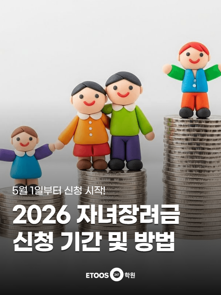 안녕하세요, 이투스247학원 공식 블로그입니다! 오늘은 2026 자녀장려금에 대해 알려드리고자 하는데요! 근로장려금과 더불어 많은 관심을 모으고 있는 이번 2026 자녀장려금, 신청 기간과 방법에 대해 지금 바로 확인하시죠! 2026 자녀장려금 알아보기! (신청 자격, 지급 금액 기준) 2026 자녀장려금은 저소득 가구의 자녀 양육을 지원하기 위한 제도인데요! 부부합산 총소득이 7,000만 원 미만이면서, 18세 미만 부양자녀가 있는 경우 신청할 수 있습니다. 자녀 1인당 최대 100만 원, 최소 50만 원이 지급되며, 총소득 기준을 제외한 나머지 수급요건은 근로장려금과 동일합니다! 2026 자녀장려금은 자녀 수에 따라 지급 가능 금액이 달라지는....... <img src="https://blogthumb.pstatic.net/MjAyNjA0MjhfMjE2/MDAxNzc3MzYxNDM4Mjgz.YD7lHw2ueGuToW6PcXxW5sfKmhSo4ulp2Xuu61fw3kYg.Z08leeS4eZzoC74gUKfNM0jCoOirn4a1wtkA3BDpNUYg.PNG/1.png?type=s3" />