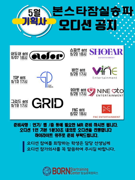 #본스타잠실송파캠퍼스 5월 기획사 내방 오디션 일정 공지 모두 열심히 준비한 만큼 좋은 결과 있기를 응원합니다!! ✨본스타가 배출해낸 대표 스타들! 카리나 (aespa) 하니 (NewJeans) 에이나 (하츠투하츠) 솔라 (마마무) 소진 (걸스데이) 영지 (KARA) 소하 (Say My Name) 진솔 (이달의 소녀) 김나영 (구구단) 남우현 (인피니트) 배우 이도현 배우 고민시 배우 최현욱 [본원 수강 및 상담 문의] ☎ 전화문의 02-6215-9000 카카오톡 상담 ID: spbornstar 공식 홈페이지 sp.bornstar.co.kr 인스타그램 @bornstarsp 예술은 감각이지만, 성공은 시스템입니다. 결과로 증명하는 본스타 잠실송파캠퍼스는 ‘데뷔’와 ‘합격’을 만....... <img src="https://blogthumb.pstatic.net/MjAyNjA0MjVfMjMx/MDAxNzc3MTA5MzAyMTg0.7EgcTZ48__rQkMFo490HgZ84lImWfj3jEfqhDVF0zscg.CSsC9htAKp8_l7sQmcHcZ20anId4Q6ilhq9L4fPQAEAg.PNG/KakaoTalk_20260425_114337788.png?type=s3" />