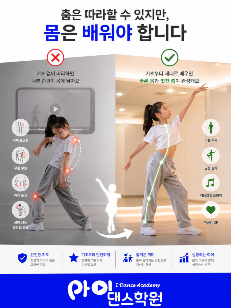 안녕하세요~ 백운역 3번출구에 위치한 아이댄스학원입니다 요즘 아이들은 유튜브나 영상으로 좋아하는 K-POP 안무를 쉽게 접할 수 있습니다. 그래서 많은 부모님들이 이렇게 생각하세요. “집에서도 따라 추는데 굳이 학원을 보내야 할까?” 하지만 여기서 중요한 차이가 있습니다. 단순 따라하기 vs 제대로 배우기 아이들이 영상을 보며 춤을 추는 것은 ‘흉내 내기’에 가깝습니다. ✔ 동작의 순서만 기억 ✔ 빠르게 따라하는 재미 ✔ 완성보다 흥미 중심 반면 학원에서는 다릅니다. ✔ 몸의 중심 (코어) 잡기 ✔ 정확한 각도와 방향 ✔ 힘을 쓰는 타이밍 ✔ 리듬과 표현력 같은 안무라도 완전히 다른 결과가 만들어집니다. 기초 없이 따라하면....... <img src="https://blogthumb.pstatic.net/MjAyNjA0MjdfMTk4/MDAxNzc3MjU5OTU2ODA1.5kQa6lTQl_yH_h3vfNcyeo77xo1So8M8yqOrBk-syMYg.UbVGMYIdlBcTuyEPESw_JirYLUMbTcgtt_yjNaoFujEg.PNG/ChatGPT_Image_2026%3F%85%84_4%3F%9B%94_27%3F%9D%BC_%3F%98%A4%3F%9B%84_12_18_59.png?type=s3" />