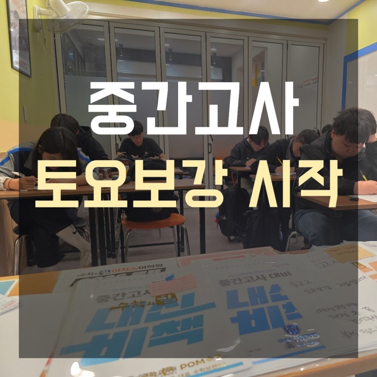 이 시기가 되면 늘 같은 장면을 봅니다. 아이들 분위기가 눈에 띄게 달라집니다. 괜히 문제집을 한 권 더 꺼내보고, 평소보다 더 많이 해야 할 것 같은 마음에 조금씩 조급해지기 시작합니다. 그래서 저는 이 시기마다 꼭 같은 말을 합니다. 얘들아 우리 드디어 배운 것을 정리를 해보는 시간이구나! 중간고사는 새로운 것을 얼마나 많이 아느냐보다 지금까지 배운 것을 얼마나 정확하게 꺼내느냐가 훨씬 중요합니다. 그래서 이 시기에는 흐름을 끊지 않고 끝까지 이어가는 관리가 핵심입니다. 그리고 그 역할을 하는 것이 바로 이번 중간고사 대비 토요보강입니다. 토요보강에서는 뭘 하나요? 토요보강은 단순 보충 수업이 아닙니다 2026년 1학....... <img src="https://blogthumb.pstatic.net/MjAyNjA0MTVfMzcg/MDAxNzc2MjQyMzk4Mjgz.LXq7G_jlaNlLuQo65ir3pfXL93Rql44exkvwMhl-vl4g.W0xayU3ms7laJV6vvSgeHFZDdujKcsOUPQYIybqh2kUg.JPEG/KakaoTalk_20260415_173750104.jpg?type=s3" />