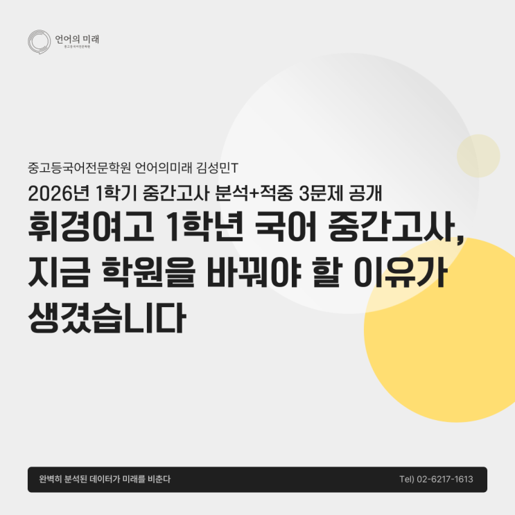 성적표를 받아든 지금, 많은 학부모님이 같은 고민을 하고 계실 겁니다. "이 점수로 고등 내신이 될까?" "지금 학원을 바꿔야 할까?" 언어의미래 김성민 선생님이 직접 분석한 2026학년도 휘경여고 1학년 국어 중간고사 해설과 수강생 성과를 공개합니다. ───────────────────────────────────────── ◆ 휘경여고 1학년 국어 전담 — 김성민 선생님 ───────────────────────────────────────── 이름 : 김성민 선생님 소속 : 언어의미래 · 휘경여고 1학년 국어 전담 · 휘경여고 시험 직후 정답 및 해설지 직접 제작 · 자체 모의고사에서....... <img src="https://blogthumb.pstatic.net/MjAyNjA0MjVfNzcg/MDAxNzc3MTA1NzgxMjc2.0cY14fTAhjulwI2e75JgIwY_63IDPNfSHuNViPHKsbkg.Y8tRVYWYELYYDUdJ_-b5G2AH9FqaulUMh0xyYpJdu9Yg.PNG/%BE%F0%B9%CC%A3%AF%B8%C5%BE%B2%B8%DE%C4%AB-%BA%ED%B7%CE%B1%D7-%B4%EB%B9%AE_-%BA%B9%BB%E7%BA%BB-005.png?type=s3" />