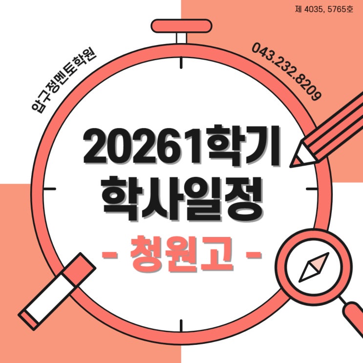 안녕하세요 압구정멘토학원 입니다! 학부모님들께서 참고하실 수 있도록 청원고등학교 2026년도 1학기 학사일정을 정리해보았습니다⭐ 각 시험일정과 체험학습, 방학식 일정을 미리 확인해보시고 아이들 학업 계획을 세우실 때 조금이나 도움이 되길 바라며 시험이 얼마 남지 않았습니다! 긴장하지 않고 실력을 잘 펼칠 수 있도록 학생들에게 많은 응원 부탁드립니다 2026년 1학기 청원고 학사일정 청원고등학교 주요 일정 참고 부탁드립니다! 출처 : 청원고등학교 홈페이지 https://school.cbe.go.kr/cw-h/M010308/list?y=2026&m=7 ⬇압구정멘토학원 고등부 1학기 학원 시간표 https://blog.naver.com/mentor8209/224197....... <img src="https://blogthumb.pstatic.net/MjAyNjA0MjNfMzUg/MDAxNzc2OTI3NTA2NTc1.mVwaNoqr_tS7BaVGkXqJIM5w3Yo4t_FG2MazkILRAn8g.N2VviW0XIwoMcJ7yUY9FtTTU7bJhKQ04dIW6Y8_exZcg.JPEG/015.jpg?type=s3" />