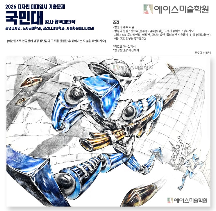 2026 디자인미대입시 정시 기출문제 (공업디자인, 도자공예학과, 공간디자인학과, 자동차운송디자인학과) 국민대 기초조형 강사 합격제안작 전수아 선생님 문제 어안렌즈로 본 공간에 병정 장난감의 구조를 관찰한 후 뛰어가는 모습을 표현하시오 조건 -병정의 개수 자유 -병정의 질감 : 간유리(불투명),금속(유광), 구겨진 종이로구성하시오 -재료 : 4B, 루나색연필, 형광펜, 모나미볼펜, 플러스펜 자유롭게 선택 (색상제한X) -어안렌즈 외부의공간표현X *어안렌즈사진제시 *병정장난감 사진제시 <img src="https://blogthumb.pstatic.net/MjAyNjA0MTlfMjUw/MDAxNzc2NTcwNzIxNzMx.WRXHTt3hC9G9VPNP25p-5f5o9uGk88DpVEw1dWWNWxMg.1MskAn_NKvZ7wZuRXkMZuenxpR2iSm3bqkc7x85xiOgg.JPEG/2026_%B1%B9%B9%CE%B4%EB_%B1%E2%C3%CA%C1%B6%C7%FC.jpg?type=s3" />