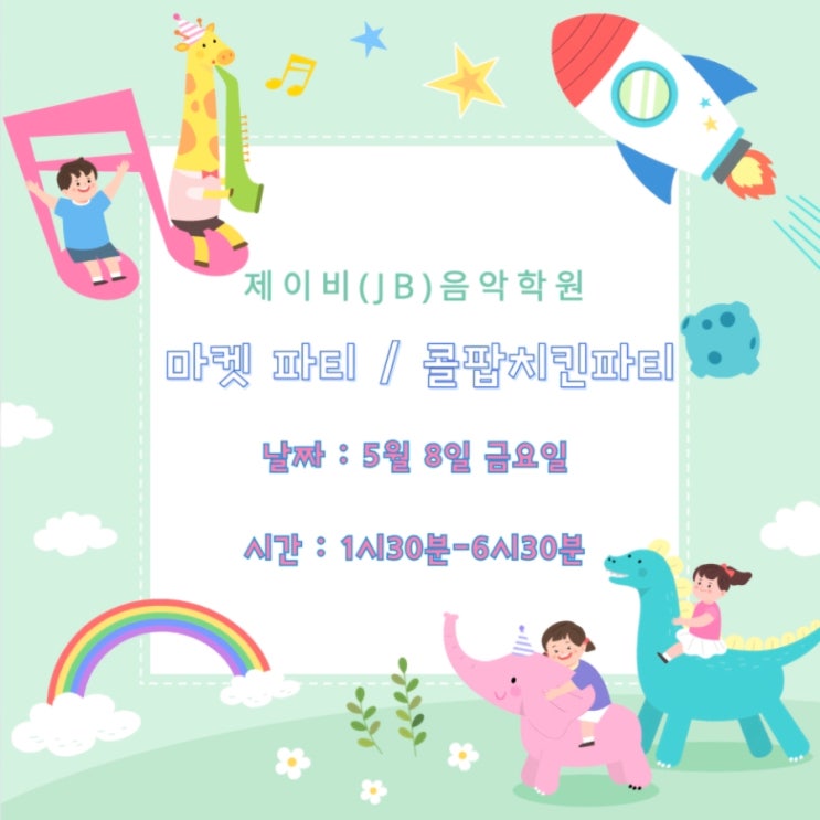 제이비 음악학원 마켓데이 파티 안내 아이들이 기다리던 특별한 하루 그동안 열심히 모은 포인트로 직접 물건을 사고 즐거운 추억까지 쌓는 마켓데이 파티가 열립니다 ▪︎날짜 : 5월 8일 (금요일) ▪︎시간 : 오후 1시 30분 ~ 6시 30분 ▪︎ 프로그램 ✨ 마켓 파티 (포인트로 장난감 & 다양한 물건 구매) 콜팝 치킨 파티 -해당일은 정규 수업 대신 행사로 진행 됩니다. -1시간 필수 참여가 아닌 자유롭게 방문 및 귀가 가능합니다. ❤️수준별 눈높이 레슨 유치부/초등부/콩쿨/입시 음악예술융합교육 안심출결어플 사용 인서울 음대 피아노과 원장 직강 문의: 02.2205.0382 #자양동피아노 #건대피아....... <img src="https://blogthumb.pstatic.net/MjAyNjA0MzBfMjg5/MDAxNzc3NTIwNDgzMzA2.O0x_97qnY15tLPutpvnrYr8ZN8hIKSxJzILsCcGPOOwg.TAbGr6LXc9PWczAgZytizgPCdxY4xI3JHHRg42zghCUg.JPEG/900_Screenshot_20260409_111830_NAVER.jpg?type=s3" />