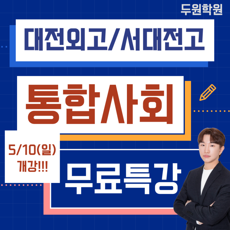 두원학원 통합사회 1회 무료특강안내 대전외고/서대전고 통합사회 수업 개강에 맞춰 수업을 직접 경험해볼 수 있는 1회 무료특강을 진행합니다. 통합사회는 단순 암기보다 개념의 흐름을 이해하고, 학교별 시험 스타일에 맞춰 대비하는 것이 중요합니다. 두원학원 통합사회 수업은 ✔ 스토리를 통한 쉬운 개념 설명 ✔ 매회 테스트 진행 ✔ 꼼꼼한 과제관리와 실시간 피드백 ✔ 학교 프린트 보충 설명 을 통해 학생들이 내신 시험을 차근차근 준비할 수 있도록 지도합니다. 개강일: 5/10(일) 대전외고반: 일 PM 1:30 ~ 4:30 서대전고반: 일 AM 10:00 ~ 1:00 ✅ 신청방법: 구글폼 신청 위치 시청역 5번 출구 타임문고 뒤 동림빌딩....... <img src="https://blogthumb.pstatic.net/MjAyNjA0MzBfMjIw/MDAxNzc3NTM1MTk5NjA5.SxaAaDSBuMFojG8TwvVmZ0jcQBGfBYONkaBQ_ShX18og.uqdezHfWIBo4da_RzI2ABMz3PAqdgTLEz6JWfHuIFnsg.PNG/1.png?type=s3" />