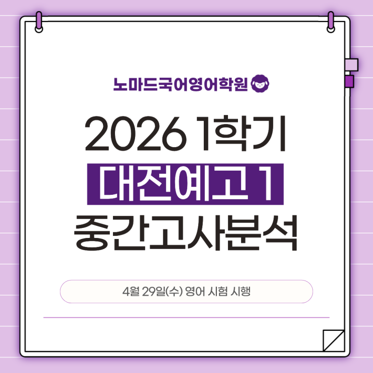 안녕하세요. 노마드국어영어학원입니다. 모든 시험이 마무리되었습니다. 짧은 연휴 잘 보내고, 건강하게 기말고사 준비를 할 수 있도록 합시다:) 선생님은 선생님의 일을 하겠습니다. ! 대전예고1 영어 시험 분석 ! 중요하다고 표시되어 있는 곳에서 무조건 출제가 되는 영어 반복의 힘, 반복이 중요한 영어 반복적으로 읽는 것은 당연, 지문의 핵심 논리 찾기 이번 시험은 한마디로 "암기형이 아닌 사고형" 시험이었습니다. 이제는 지문을 흘려 읽고 감으로 푸는 방식으로는 객관식에서도, 서술형에서도 점수를 가져가기 어려운 구조였습니다. 반대로 말하며, 지문을 제대로 정리하고 글의 흐름과 핵심 논리를 명확히 이해한 학생에게....... <img src="https://blogthumb.pstatic.net/MjAyNjA0MzBfMzYg/MDAxNzc3NTI5MDA5NDc0.wAbkU_SqJb0ZUvzc18zVP6LUky8ctenM2o4QLo3GSawg.0Lh6zTY_BYOzf7pKrVQoMFZdlEioPPFUn4IZIT1YYoUg.PNG/1.png?type=s3" />