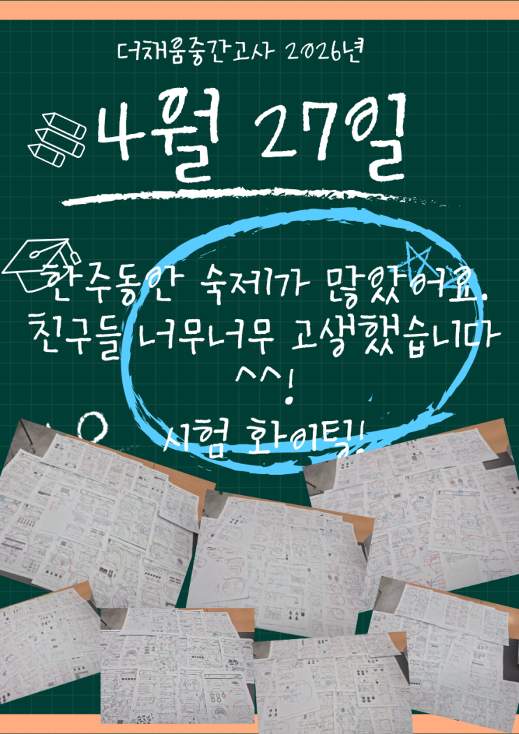 안녕하세요! 아이들의 꿈에 정성을 더하는 더채움학원입니다. 드디어 내일, 4월 27일 월요일은 우리 더채움 친구들이 그동안 갈고닦은 실력을 뽐내는 학원 중간고사 날입니다! 시험을 하루 앞둔 오늘, 학원 분위기는 평소보다 더 진지하고 뜨거운데요. 우리 아이들이 어떻게 준비해왔는지 살짝 들려드릴게요. 일주일간의 불타는 레이스 이번 시험을 준비하며 우리 아이들, 정말 엄청난 양의 중간고사 대비 숙제를 소화해냈어요. 쏟아지는 문제집과 유인물에 힘들 법도 한데, 묵묵히 채워나가는 모습이 얼마나 대견했는지 모릅니다. 특히 이번 시험은 실제 학교 시험 난이도와 딱 맞춰 출제했기 때문에 아이들도 긴장감을 가지고 임하고....... <img src="https://blogthumb.pstatic.net/MjAyNjA0MjZfMTEg/MDAxNzc3MTg0NTUyOTg0.BKcC4ikHigED6BFHfTjOb48umIntllEAukQwnVBOoqkg.PgFeTisGO4IkVkvKzqHHOwZ_frt6fbsFaSUczY9NQRYg.PNG/%C1%A6%B8%F1%C0%BB_%C0%D4%B7%C2%C7%D8%C1%D6%BC%BC%BF%E4._%282%29.png?type=s3" />