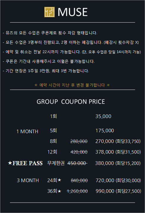 여러분~즐거운 5월을 맞이하여 뮤즈가 이벤트를 가지고 왔습니다.^^ 어린이날,어버이날, 스승의날 등등 5월은 지출이 참 많죠 ㅜㅜ 그래서 뮤즈가 파격적인 할인가와 동시에 프리패스권을 오픈합니다. 여름도 준비해야하고 운동은 많이하고 싶은데 지출이 많은 요즘 속상한 마음을 달래줄 특별한 이벤트! 즐겁고 행복하게 운동하고 건강한 몸 바른자세로 아름다움을 유지하세요~^^ <가격표> <할인권 모음> (이용 안내) *모든 수업은 사전 예약 후 3명부터 진행되고, 2명 이하는 폐강됩니다. *예약 및 최소는 전날 22시까지 가능합니다.(단, 오후 수업은 당일 14시까지 가능) *쿠폰은 기간 내 사용해주시고 이월은 불가합니다. *기간....... <img src="https://blogthumb.pstatic.net/MjAyNjA0MjhfMzAg/MDAxNzc3MzU2MDc1Mjk5.Jpf0zm3NcX0ak9Kf01S8bjJjA7ryTX_lSs_Rfab_CQUg.JZguPQgmarClZPpSk7kYWoXKi4QsgEn4U2H6osK7YjUg.PNG/%B0%A1%B0%DD%C7%A5%C1%A4%B8%AE4%BF%F9.png?type=s3" />