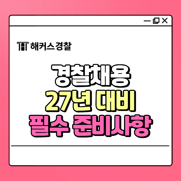 안녕하세요 :) 경찰을 목표로 준비 중이신 분들이라면 지금 시점에서 무엇을 해야 할지 가장 고민되실 텐데요. 오늘은 경찰채용 기준으로 2027년 경찰채용 대비 전략을 핵심만 깔끔하게 정리해드릴게요. 처음 준비하는 분들도 바로 이해할 수 있도록 정리했습니다. ⓐ 경찰공무원 공채 채용 절차 경찰채용 절차는 단계별 평가로 진행됩니다. 각 단계마다 준비 포인트가 다르기 때문에 미리 흐름을 알고 준비하는 것이 중요해요. ✔ 채용 절차 순서 필기시험 체력시험 면접시험 최종합격 특히 필기 → 체력 → 면접 순으로 이어지기 때문에 한 단계에서 무너지면 다음 단계로 갈 수 없어요. 그래서 처음부터 균형 있게 준비하는 것이 중요합....... <img src="https://blogthumb.pstatic.net/MjAyNjA0MjRfMTE3/MDAxNzc2OTk3OTY0MTYw.8nHQeU6KVHKayY8U75yTCbCi1G1R7QJ-XwxIJ7Xg7z0g.aiLyLalWoFP4CDZJixhy8wtB4JvBZCbq9rEbZHf9Dd0g.PNG/%B9%DA%BC%F6%BE%C6_%BD%E6%B3%D7%C0%CF_-_2026-04-24T113225.121.png?type=s3" />