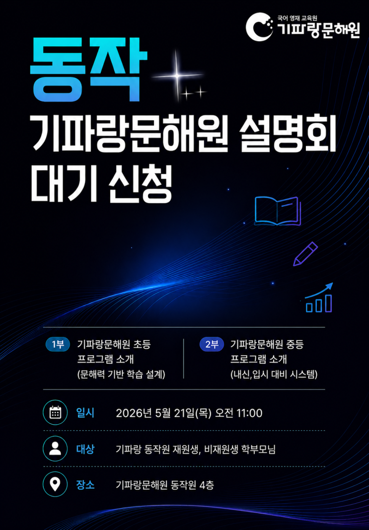 안녕하세요~! 국어 성적에 커다란 물결을 일으키는 기파랑문해원 동작원입니다! 5월 21일 목요일! 오전 11시 학원에서 진행하는 이번 기파랑문해원 새학기 설명회가 신청 마감되었습니다! 학부모님의 관심과 성원에 진심으로 감사드립니다. 한 분이라도 더 많은 학부모님께 기파랑문해원의 콘텐츠와 시스템을 설명드리고 싶어 현재 기파랑문해원 동작원에서 설명회 대기를 받고 있습니다. 미처 동작 기파랑 설명회를 신청하시지 못한 학부모님께서는 설명회 신청 대기를 원하시는 분은 하단 신청링크 신청해주시면 됩니다. -설명회 대기 신청 링크- 설명회 신청하시는 학부모님께 추후 방문 확정 연락을 드릴 예정입니다^^ 많은 관심 부....... <img src="https://blogthumb.pstatic.net/MjAyNjA0MjVfMjQz/MDAxNzc3MDkxMzM5OTI3.Sjy2tLMCRmuZb-glJloGdoR71IauK-O3BxgXMecwbLIg.8B3PR7ae_9eGfhbQfokgS-fS775EPoew-J3UdjRzLlcg.PNG/image.png?type=s3" />